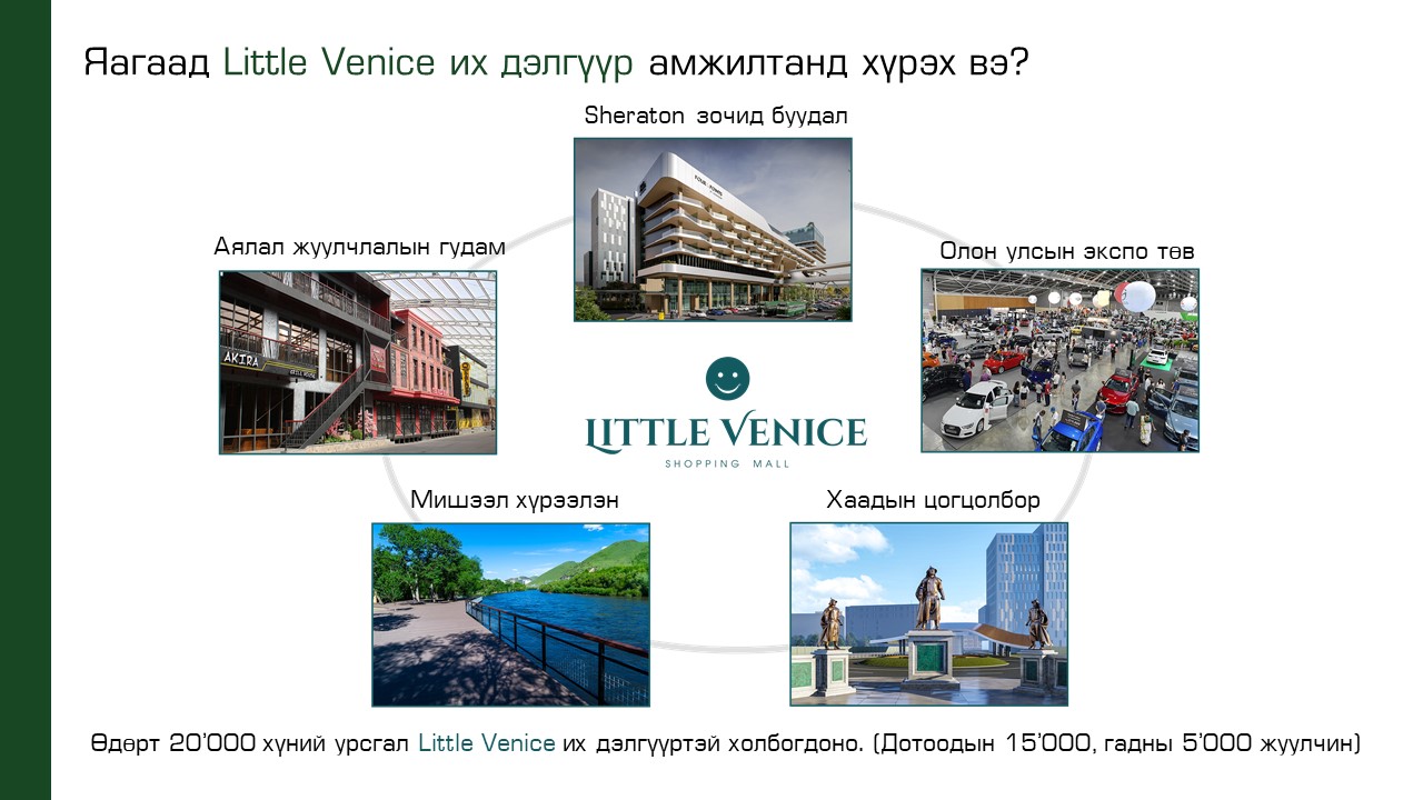 Өөрийн бизнесээ өргөжүүлэх жилдээ 1 сая жуулчин хүлээн авах орчинд, өдөртөө 20 000 хүний урсгалд таны бизнес амжилттай байх нь тодорхой юм.