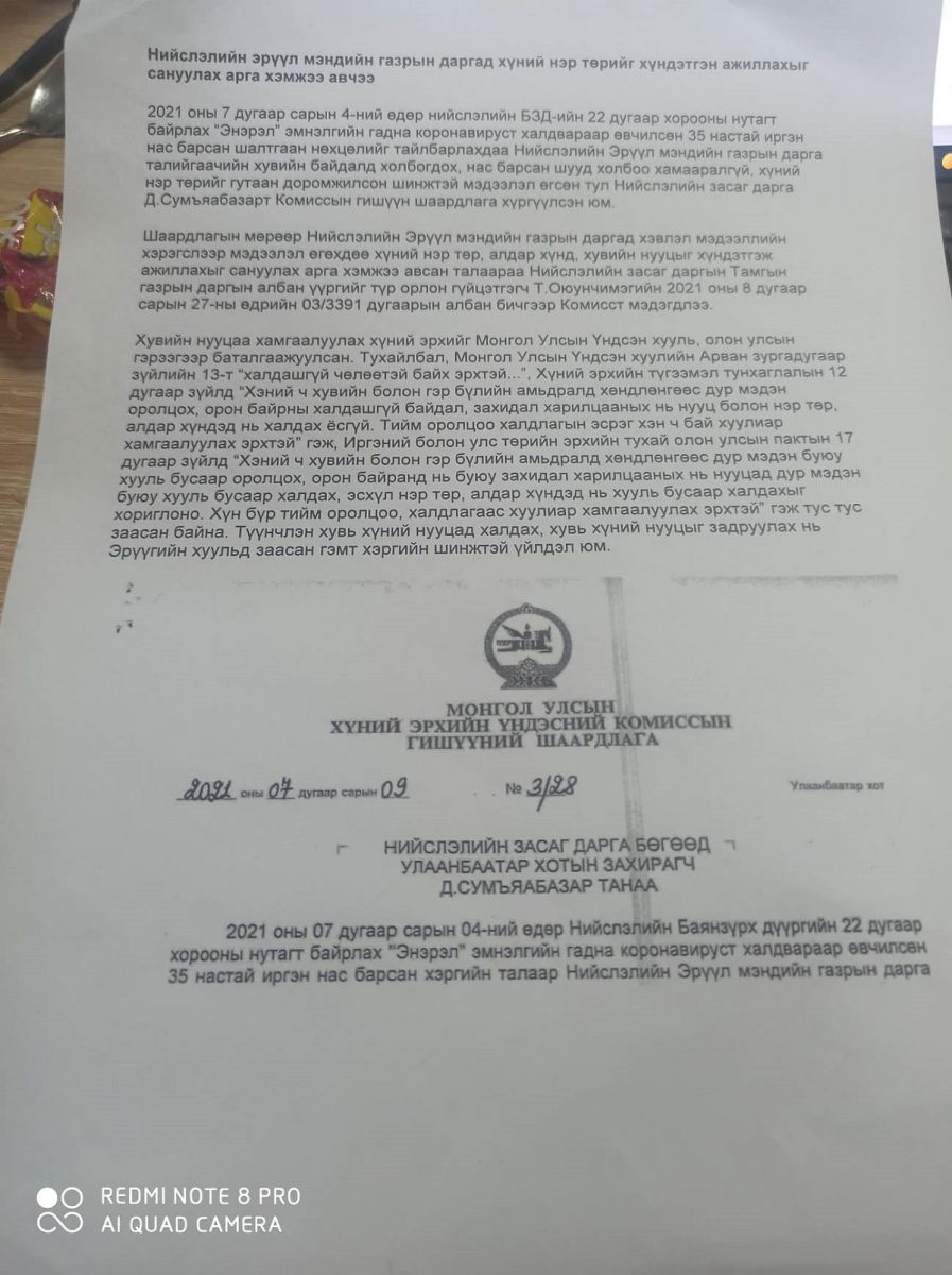 Монголчууд бид цар тахалд нуруугаа авахуулж байна. Наад захын өрхийн эмнэлгийн үүдээр шагайгаад үзээрэй. Үнэхээр өр өвтгөм дүр зургийг тэндээс харж болно. Корона туссан иргэдийн цуваа тасралтгүй хөвөрч, эмч, сувилагч нар борви бохис хийлгүй ажиллаж байна. Эмнэлгийн хүрэлцээгүйн улмаас гэртээ нас барагсдын тоо ч олшрох болов. Ийм л хэцүү цаг үед Нийслэлийн эрүүл мэндийн салбарыг удирдлага менежментийн тогтолцоогоор хангаж ажиллах үүрэгтэй НЭМГ-ын дарга юу хийж байна вэ.