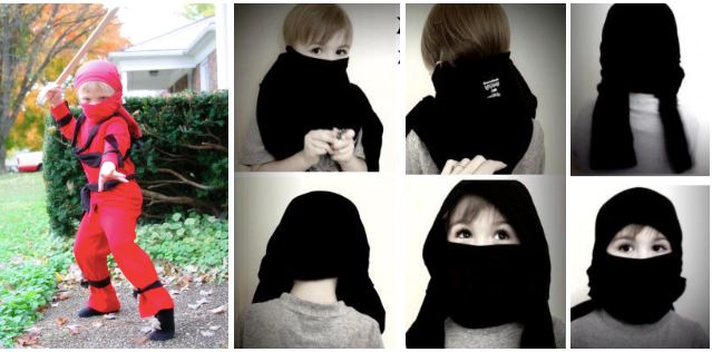 Хэллоуины баяраар хамгийн их өмсдөг хувцасны нэг нь нинжагийн өмсгөл. Үүнийг хийхэд мөн л оёх шаардлага байхгүй. Ижил өнгийн өмд, цамц л хэрэгтэй. Хар, улаан, саарал эсвэл хөх өнгө нь илүү дээр. Судлуудынх нь өргөн 7 см байхаар даавуугаа хайчилж, зурагт үзүүлсний дагуу уяж өг.