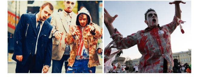 Хуучин хувцсаа гаргаад хайчны тусламжтайгаар урагдаж сэмэрсэн болгон хувиргаад будгаар бохирдуулж, цусны толбо тавь. Зомби явдлыг дуурайхаа бүү мартаарай.