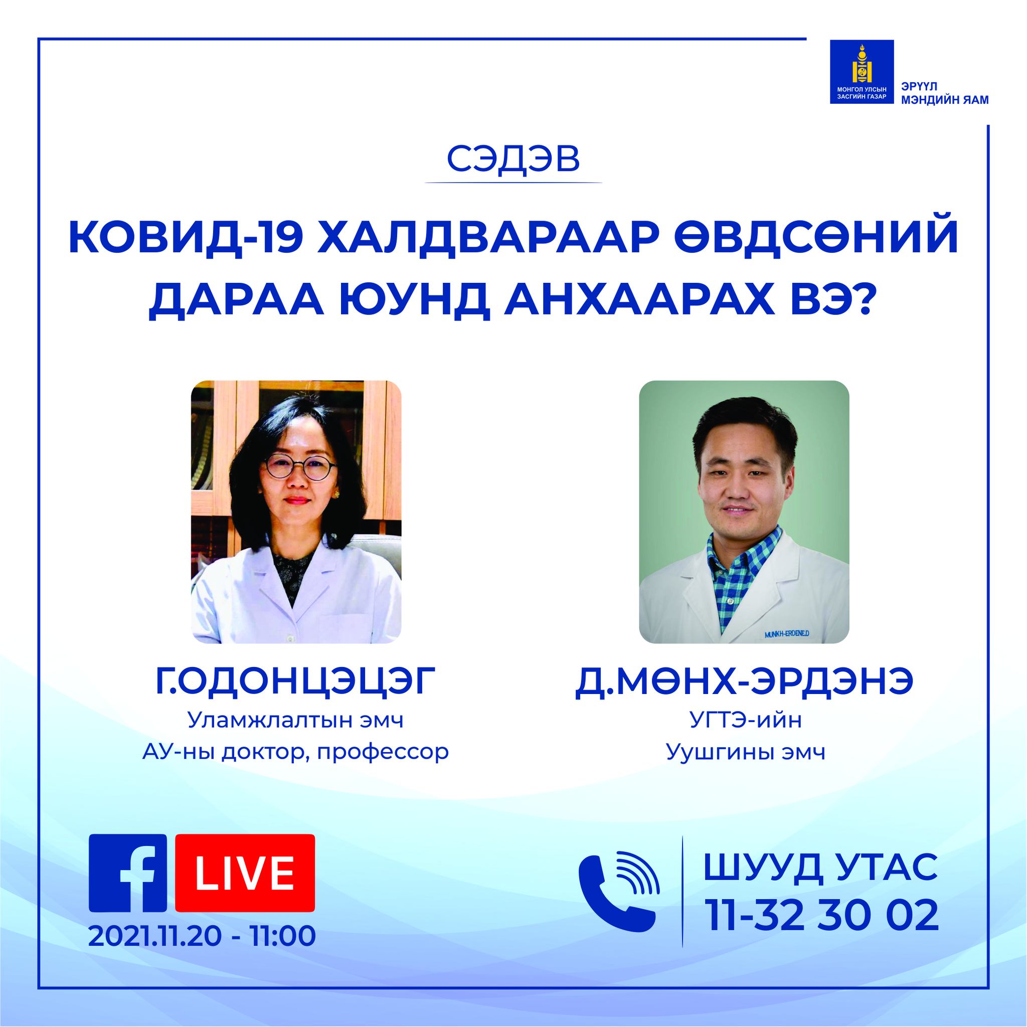 Ковидын халдвараар өвдсөний дараа амьсгалын эрхтэнд нөлөөлөх хүчин зүйл, эмчилгээ, нөхөн сэргийлэлт сэдвийн хүрээнд асуултад хариулт өгөх live Эрүүл мэндийн яамны Фэйсбүүк хуудсаар явж байна.