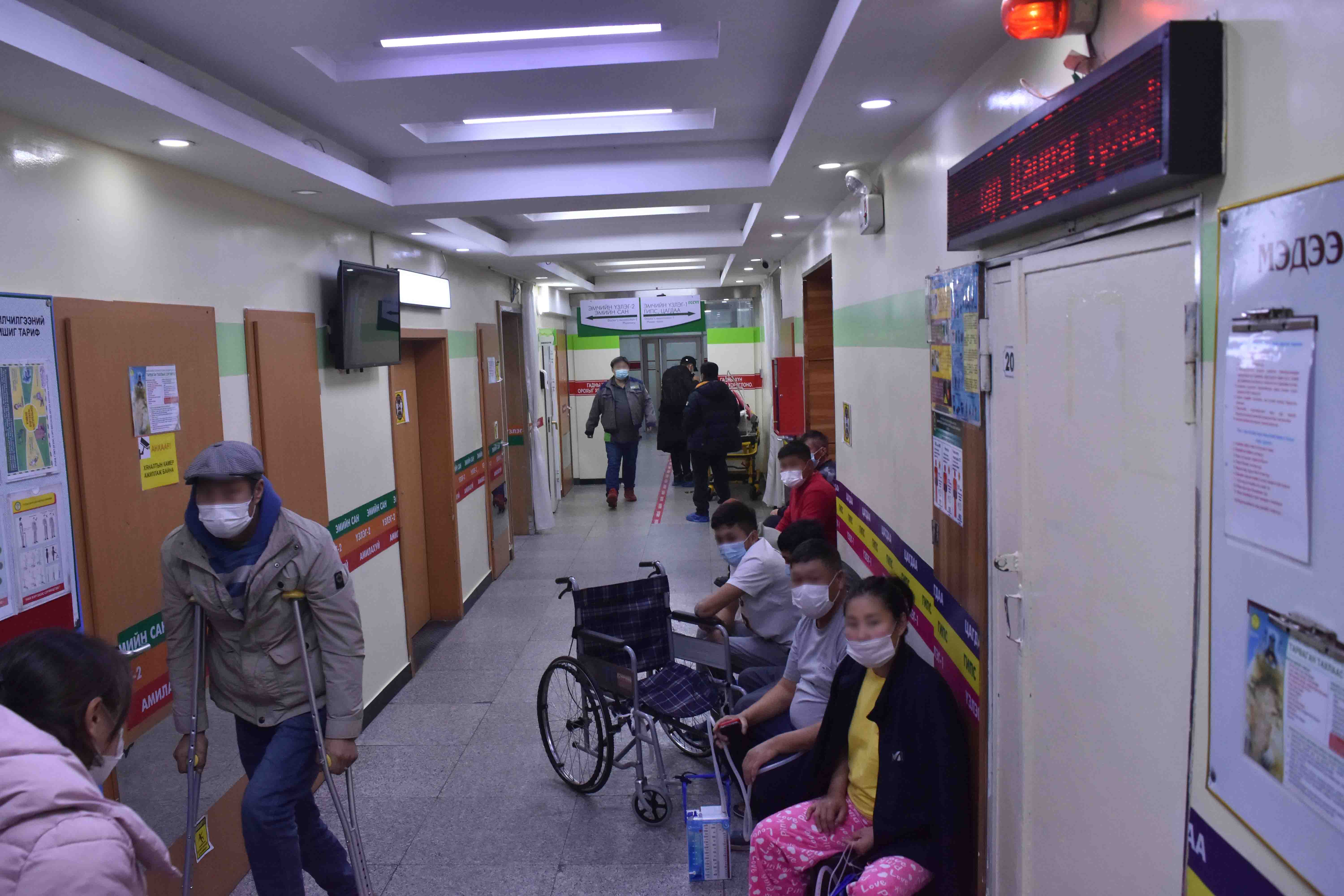 Үүднээсээ л уртаас урт машины дараалал үүсжээ. Тус эмнэлэгийг зорин машинтай ирсэн хүмүүс эгээтэй л багтахгүй, зогсоол хайж тойрно. Зогсоол хайн явах приус маркийн машинтай жолооч сая нэг зогсоол олов бололтой машинаа байрлуулан, арын хаалгаа онгойлгож нэгэн охиныг тэврэн буув. Нэг талын хөлөндөө гутал өмсөөгүйгээс гадна, гипстэй байлаа. Тэд алхсаар эмчдээ үзүүлэхээр орж буйгаа үүдний эмчид хэлсээр оров. Гэмтэл согог судлалын үндэсний төвийн үүдэнд олон хүн ар араасаа цувран зогсжээ. Үүдний эмч тэднийг ээлж дараагаар орохыг сануулсан ч үүдний жижиг хүлээн авах хэсэгт багтахгүй олон хүн байлаа. Төрөл бүрийн гэмтэлтэй хүмүүс болон тэднийг даган явах асран хамгаалагчид байв. Цээжний гэмтэлтэй, машинд мөргүүлсэн, толгойгоо боосон, таяг тулсан, хэн нэгэнд түшүүлсэн, тэргэнцэр дээр түрүүлсэн гэх мэт төрөл бүрийн өвчтөн эмчид үзүүлэхээр ээлжээ хүлээнэ.