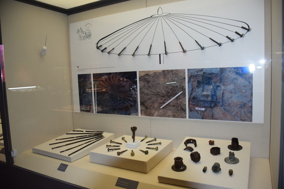 Тухайлбал, Дундад Азиас гаралтай нэхмэл эдлэлүүд, хивс, эсгий ширдэгний үлдэгдэл, мөнгөн эдлэлүүд, алт мөнгөн чимэглэлүүд, эсгий ширмэл ширдгийн сэргээсэн загвар, авсны алтан чимэглэл модон суурины хамт, гэзэг үс торгон уутын хамт, хувцасны хэсэг, шавар ваар сав зэргийг дэлгэжээ.