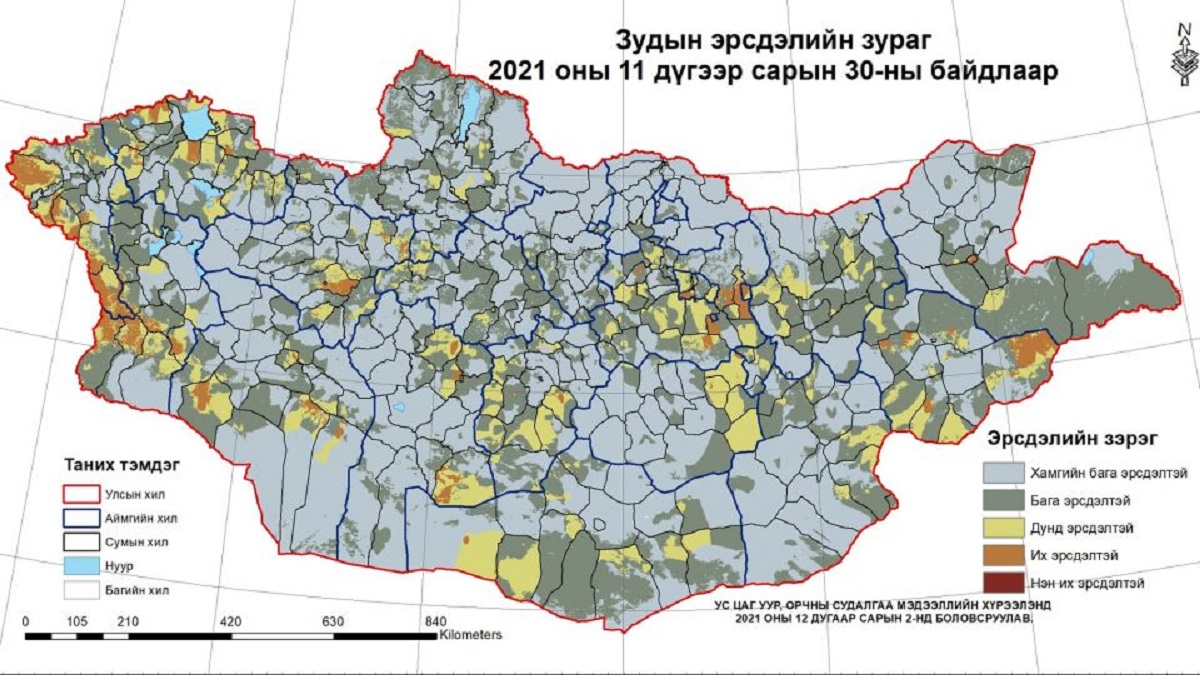 Ус цаг уур, орчны судалгаа мэдээллийн хүрээлэнгээс ган зуншлага, цас зуд, бэлчээртэй холбоотой газрын ажиглалтын болон хиймэл дагуулын олон төрлийн мэдээг нэгтгэн боловсруулж, зудын эрсдэлийн зураг мэдээг гаргалаа.
