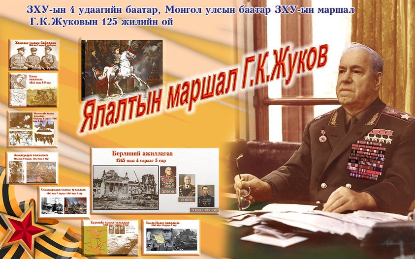 ЗХУ-ын дөрвөн удаагийн баатар, БНМАУ-ын баатар, ЗХУ-ын маршал Г.К.Жуковын мэндэлсний 125 жилийн ойн арга хэмжээ өнөөдөр Улаанбаатар дахь Русский домд болж байна.