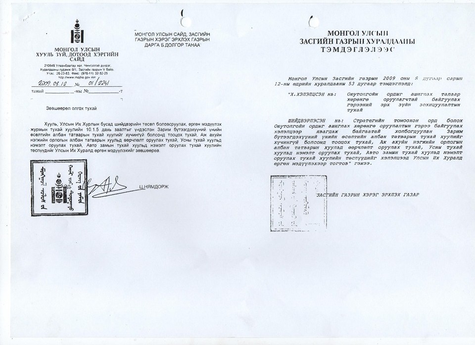 Мөн УИХ-ын 2009 оны долоодугаар сарын 16-ны өдрийн 57 дугаар тогтоолоор Хөрөнгө оруулалтын гэрээг байгуулах эрх олгохдоо Хүчин төгөлдөр үйлчилж буй хууль тогтоомжид нийцүүлэн УИХ-ын 40 дүгээр тогтоол болон Эдийн засгийн байнгын хорооноос 2009 оны тавдугаар сарын 8-ны өдөр Хөрөнгө оруулалтын гэрээний төслийн талаар гаргасан санал дүгнэлтийг харгалзах тухай тусгасан байдаг.