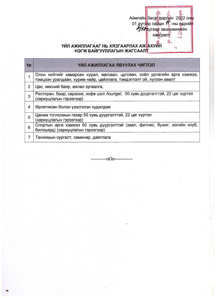 Түүнчлэн төрийн болон төрийн бус байгууллагын ажилтан, албан хаагчдад ажлын байранд халдвар хамгааллын дэглэм сахиулж ажиллах, зайлшгүй шаардлагатай тохиолдолд ажилтан, алба хаагчдыг гэрээсээ цахимаар ажиллах нөхцөл боломжийг бүрдүүлж ажиллахыг сум, албан газар, аж ахуйн нэгж байгууллагын дарга, захирал нарт үүрэг болгосон байна.
