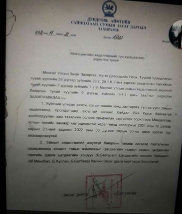 Захирамжинд “Хүйтний улиралд хотын төвийн замд хальтиргаа, гулгаа үүсч замын хөдөлгөөнд оролцогчдод аюултай нөхцөл байдал бий болж байгаатай холбогдуулан зам тээврийн ослоос урьдчилан сэргийлэх зорилгоор Мандалговь хотын төвийн замаар мотоцикльтой хөдөлгөөнд оролцохыг түр хязгаарласугай” гэжээ.