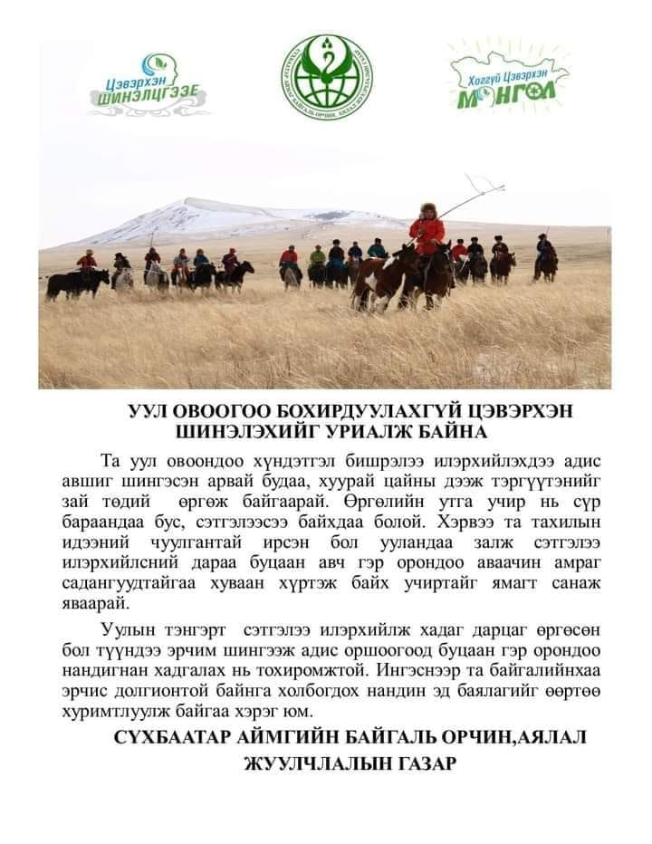 Сүхбаатар аймгийн Байгаль орчин, аялал жуулчлалын газраас уул, овоо бохирдуулалгүй цэвэрхэн шинэлэхийг уриалсан уриалга гаргажээ. Сар шинийн өдрүүдэд Сүхбаатар аймгийн нутагт байх Алтан овоо, Шилийн богдыг зорих иргэдийн хөл хөдөлгөөн ихэсдэг бөгөөд үүнтэй холбоотойгоор хог хаягдал ч ихэсдэг байна. Тиймээс халдварт өвчинтэй өнөө цагт уул, овоондоо сүсэглэн мөргөх гэж буй иргэд арвай будаа, хуурай цайныхаа дээжийг алсын зайнаас өргөх, хадаг дарцаг өргөсөн бол эрчим шингээж, адис оршоогоод буцаан гэр орондоо нандигнан хадгалах гэх мэт уриалгыг дэвшүүлжээ.