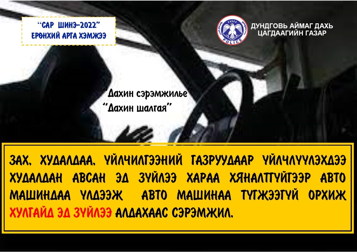 “САР ШИНЭ-2022” ерөнхий арга хэмжээний хүрээнд аймгийн төвд үйл ажиллагаа явуулдаг хүнсний бөөний төв, зах, худалдаа үйлчилгээний газруудад хулгайн гэмт хэргээс урьдчилан сэргийлэх зорилгоор “Зах” хэсэгчилсэн арга хэмжээг нэгдүгээр сарын 31-ний өдрийг дуустал хугацаанд зохион байгуулж байна.