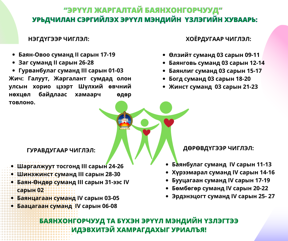 Аймгаас томилсон дөрвөн ажлын хэсэг 20 сум суурин газарт хүрч, уг үзлэг оношилгоог гардан явуулах бөгөөд урьдчилан сэргийлэх эрүүл мэндийн үзлэг шинжилгээний сумдад зохион байгуулах хуваарийг хүргэж байна.