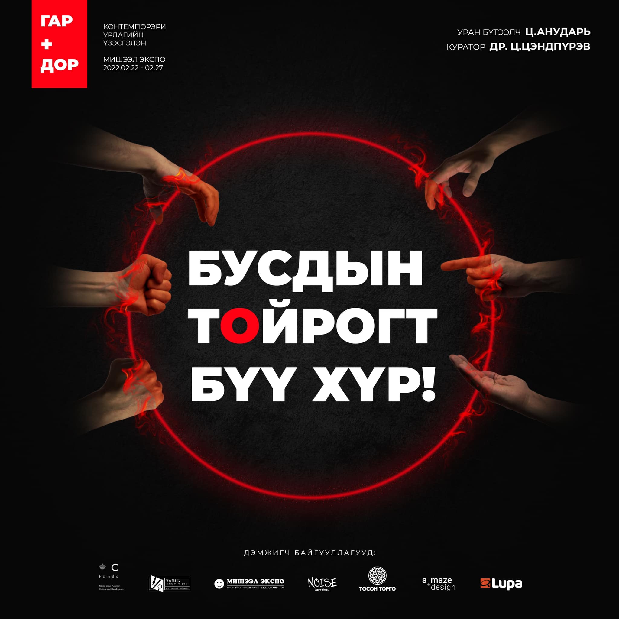 Залуучуудын сэтгэлзүйн эрүүл мэндийн асуудлыг хөндсөн “Гар+Дор” үзэсгэлэн энэ сарын 22-27-ны өдрүүдэд “Мишээл экспо” төвийн үзэсгэлэнгийн танхимд зохион байгуулагдах гэж байна. Тус үзэсгэлэн нь залуучуудад тулгамддаг нийгмийн олон асуудлууд болох зөвшөөрөлгүй биед хүрэх, үг хэлээр гадуурхах зэрэг үйлдлүүдээс үүдэлтэй хандлагыг өөрчлөх, олон нийтэд нөлөөлөх зорилготой аж.