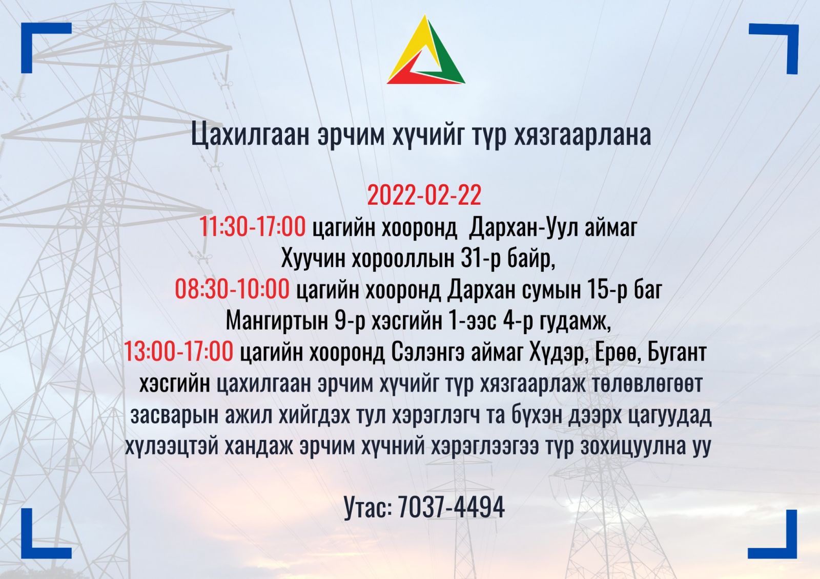 Тухайн орон нутгийн иргэдийг цахилгаан хязгаарлахтай холбоотойгоор хэрэглээгээ зохицуулахыг “Дархан, Сэлэнгийн цахилгаан түгээх сүлжээ” ХХК-аас анхааруулсан байна.