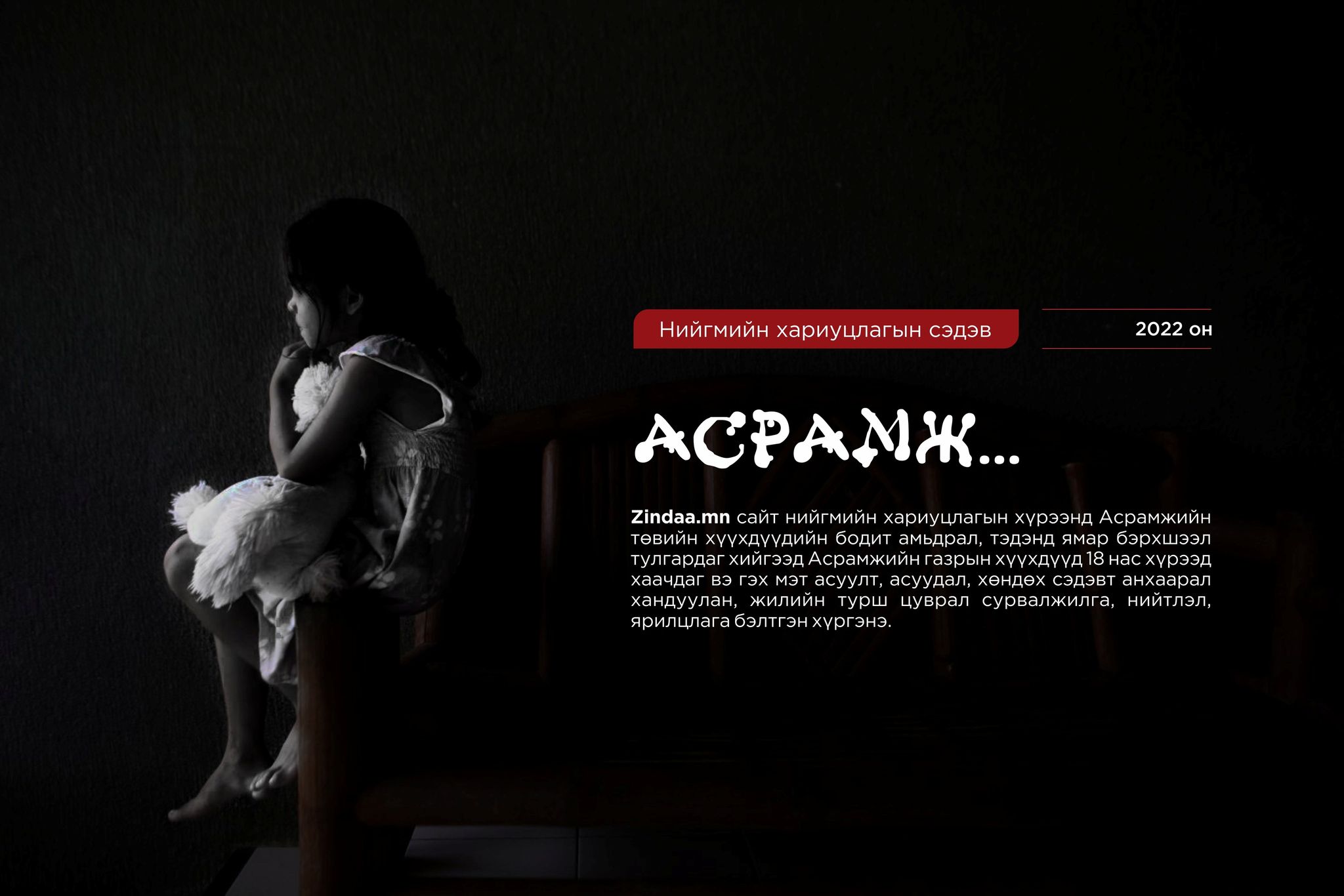 Zindaa.mn сайт нийгмийн хариуцлагын хүрээнд Асрамжийн төвийн хүүхдүүдийн бодит амьдрал, тэдэнд ямар бэрхшээл тулгардаг хийгээд Асрамжийн газрын хүүхдүүд 18 нас хүрээд хаачдаг вэ гэх мэт асуулт, асуудал, хөндөх сэдэвт анхаарал хандуулан, жилийн турш цуврал сурвалжилга, нийтлэл, ярилцлага бэлтгэн хүргэхээр төлөвлөлөө. Цувралыг сэтгүүлч Д.Үржинбадам бэлтгэж, 14 хоног тутамд уншигчдын хүртээл болгоно.