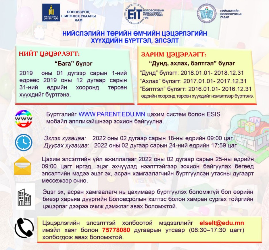Цэцэрлэгийн бага бүлгийн цахим бүртгэл өнөөдрийн 17:59 цаг хүртэл WWW.PARENT.EDU.MN цахим систем болон гар утасны ESIS аппликэйшнээр зохион байгуулагдаж байна. Бүртгэлд 2019 оны нэгдүгээр сарын 1-нээс 12 дугаар сарын 31-ний өдрийн хооронд төрсөн хүүхдүүд хамрагдах боломжтой.