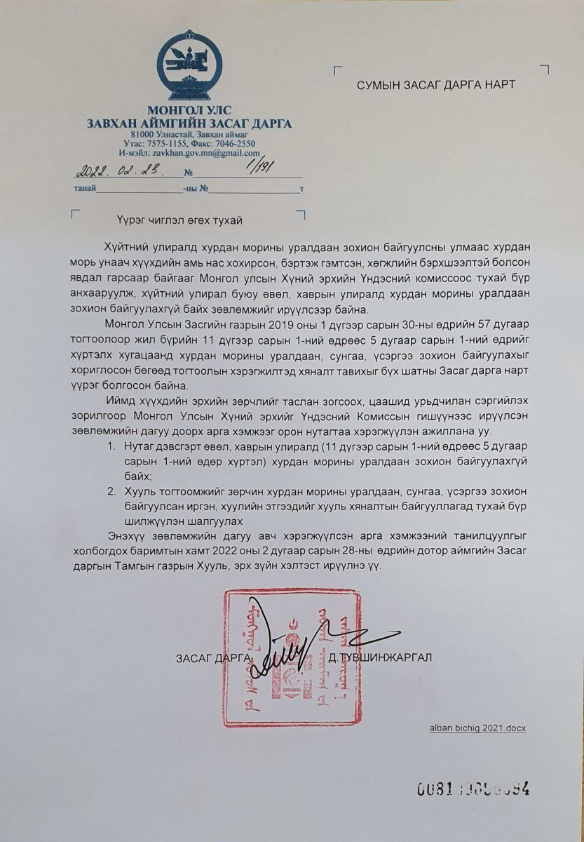 Энэ хүрээнд бүх сумын нутаг дэвсгэрт дээрх хугацаанд хурдан морины уралдаан зохион байгуулахгүй байх, хууль тогтоомжийг зөрчин хурдан морины уралдаан, сунгаа, үсэргээ зохион байгуулсан иргэн, хуулийн этгээдийг хууль хяналтын байгууллагад тухай бүр шилжүүлэн шалгуулах үүргийг аймгийн Засаг дарга Д.Түвшинжаргал сумын Засаг дарга нарт үүрэг болголоо.