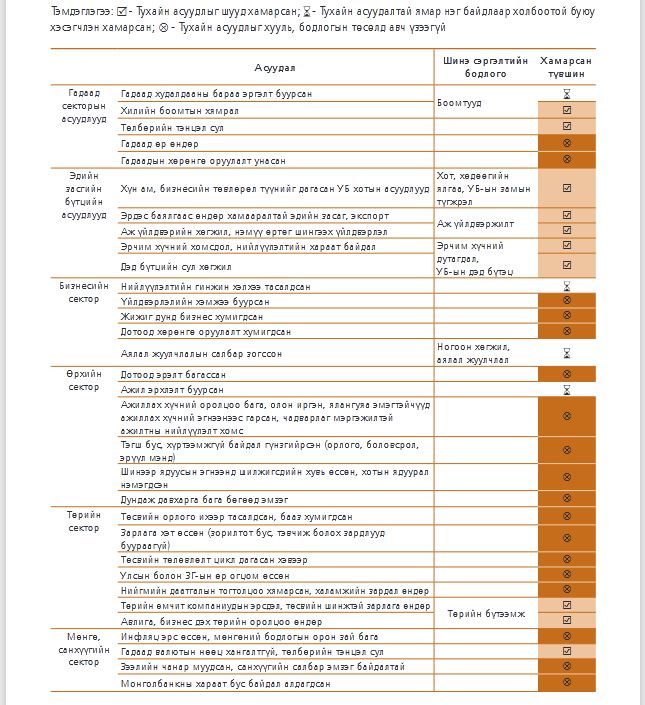 Тодруулбал, Шинэ сэргэлтийн бодлогын төсөлд эдийн засгийн асуудлуудыг хэрхэн хамруулсныг дараах хүснэгтээр тодорхой харуулжээ.