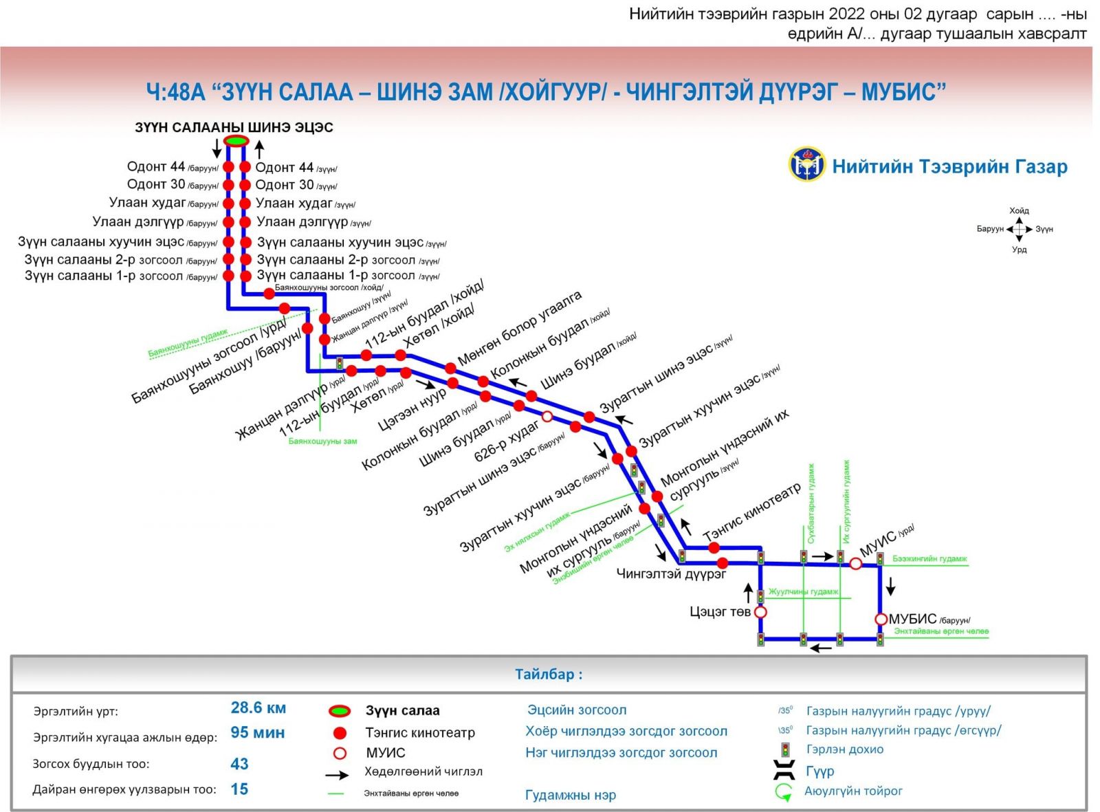 Нийслэлийн нийтийн тээврийн үйлчилгээний хүртээмжийг нэмэгдүүлэх, иргэдийн хэрэгцээ шаардлагыг үндэслэн Ч:48А чиглэлийг шинээр нэмлээ. Тус чиглэл нь 2022 онд ашиглалтад орсон шинэ авто замын трассын дагуу буюу “Зүүн салаа-Шинэ зам /хойгуур/-Чингэлтэй дүүрэг -МУБИС” гэсэн чиглэлээр иргэдэд үйлчилгээ үзүүлэх юм.