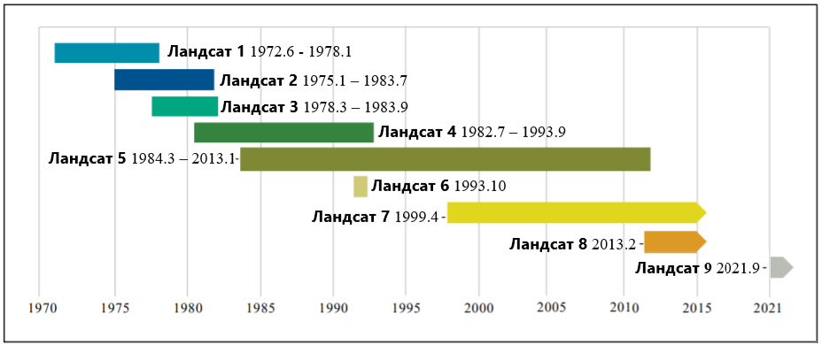 1972 оны 7 сард “дэлхийн нөөц технологи”гэдэг нэртэйгээр анх хөөргөсөн, хожим нь Ландсат 1 болгож өөрчилсөн бөгөөд дэлхийн хамгийн анхны ажиглалтын хиймэл дагуул юм. Зураг 2-т Ландсат хиймэл дагуулын хөөргөсөн цаг хугацааны мөчлөгийг харуулж байна.
