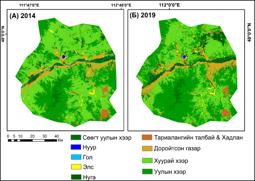 Судалгааны үр дүнд: хуурай хээрийн анги нь 42.8%, уулын хээр 3.84%, гол 1.1%, нуга (1.6%), тариалангийн талбай & хадлан газар 0.7%-иар багасаж, доройтсон газар 40.01%, сөөгт уулын хээр 8.34%, нуур 0.1%, элс 1.51%-иар нэмэгдсэн байна.
