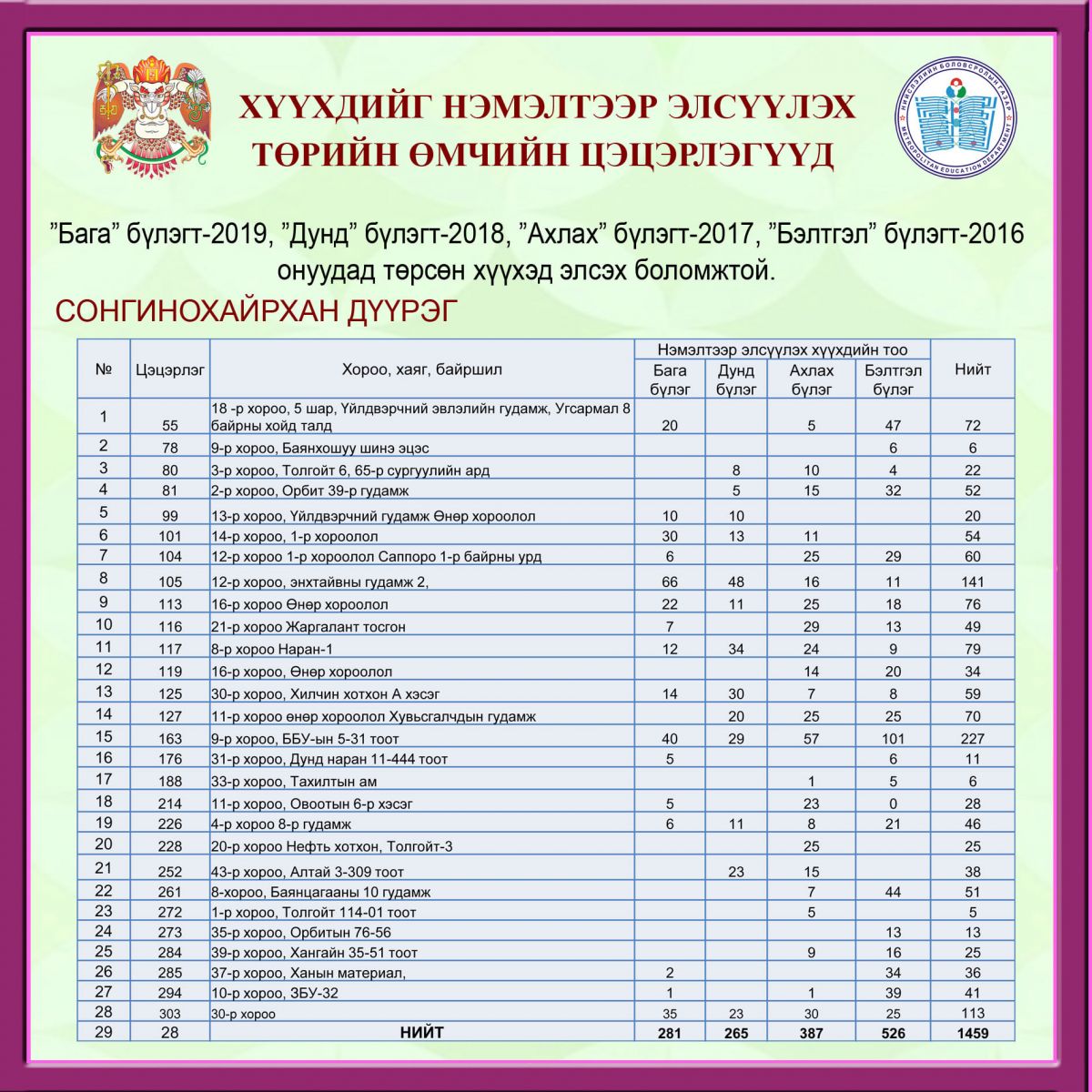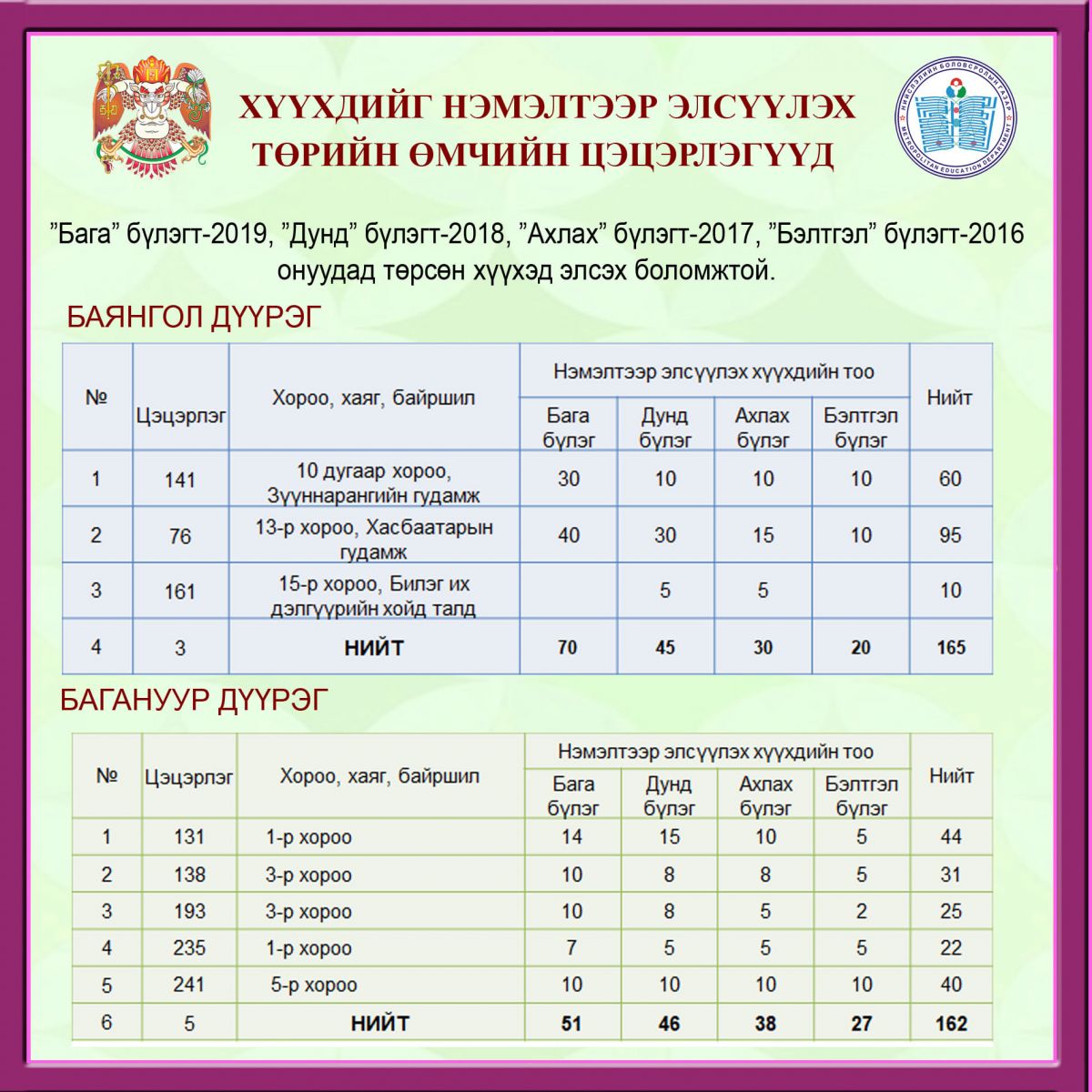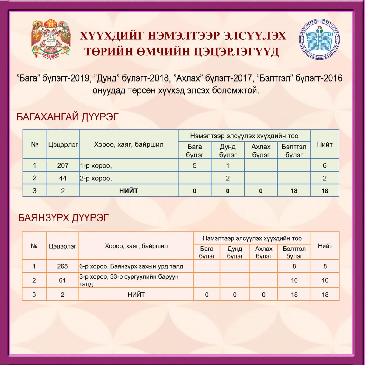 Элсэлт, бүртгэлийг зохион байгуулсны дараагаар нийслэлийн 8 дүүргийн 88 цэцэрлэгт нийт 3575 хүүхдийг элсүүлэх сул орон тоо үлдсэн судалгаа гарсан. Иймд эцэг эх, асран хамгаалагчид та бүхэн дээрх цэцэрлэгүүдэд хандан, харьяаллын дагуу хүүхдээ элсүүлэн суралцуулах боломжтой.