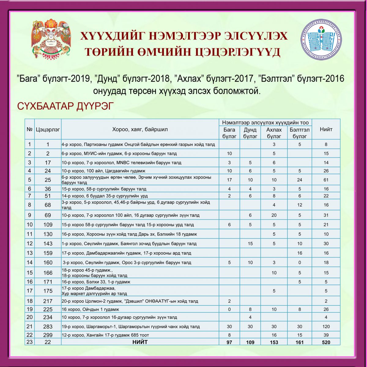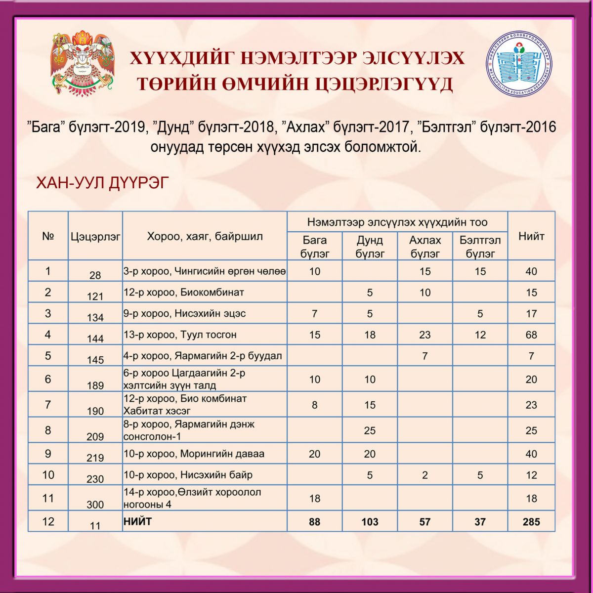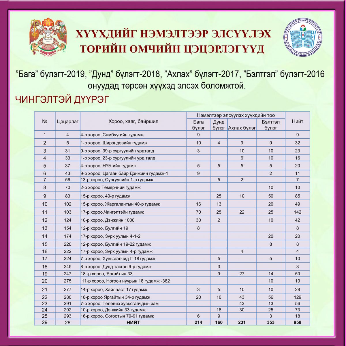 Элсэлт, бүртгэлийг зохион байгуулсны дараагаар нийслэлийн 8 дүүргийн 88 цэцэрлэгт нийт 3575 хүүхдийг элсүүлэх сул орон тоо үлдсэн судалгаа гарсан. Иймд эцэг эх, асран хамгаалагчид та бүхэн дээрх цэцэрлэгүүдэд хандан, харьяаллын дагуу хүүхдээ элсүүлэн суралцуулах боломжтой.
