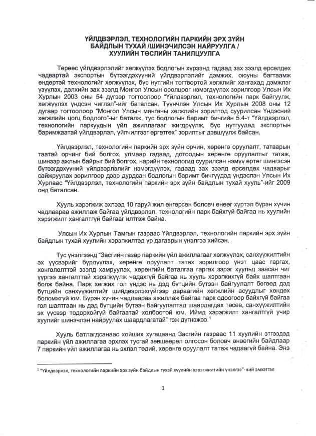 Үйлдвэрлэл, технологийн паркийн эрх зүйн байдлын тухай хуулийн шинэчилсэн найруулгын төсөл хуульчлагдан батлагдсанаар Монголын эдийн засагт үлэмж ач холбогдол дагуулах хүлээлттэй байна.