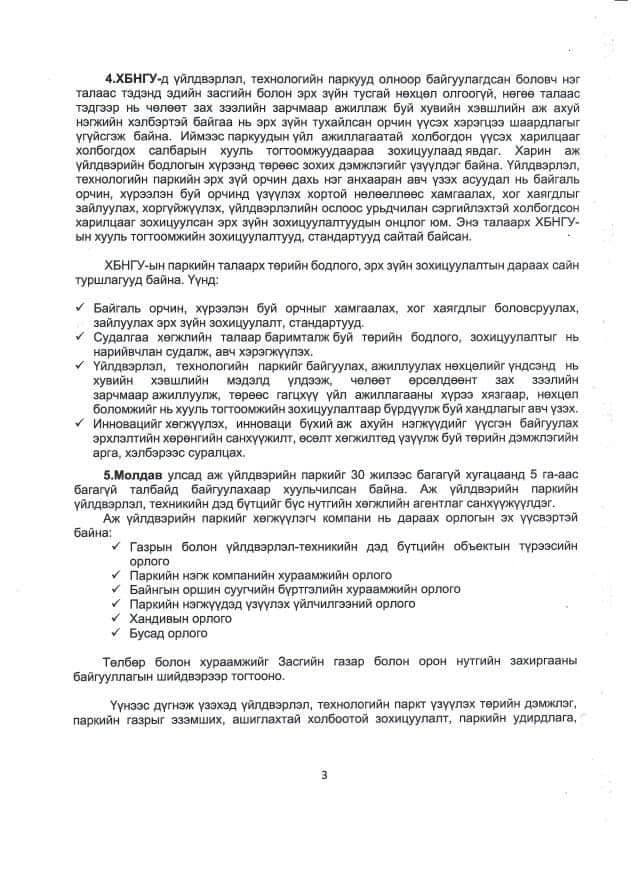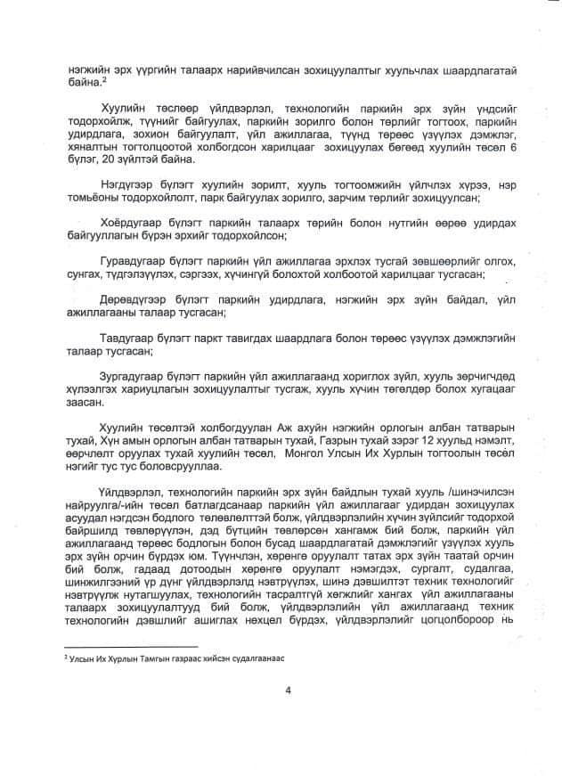 Мөн эдийн засаг, нийгмийн хөгжилд олон талын ээл дагуулах бусад салбаруудын үйлдвэрлэлээ ч бодлогоор дэмжиж, парк хэлбэрээр хөгжүүлэхэд дээрх хууль нэн чухал дэмжлэг болох хүлээлттэй байна.