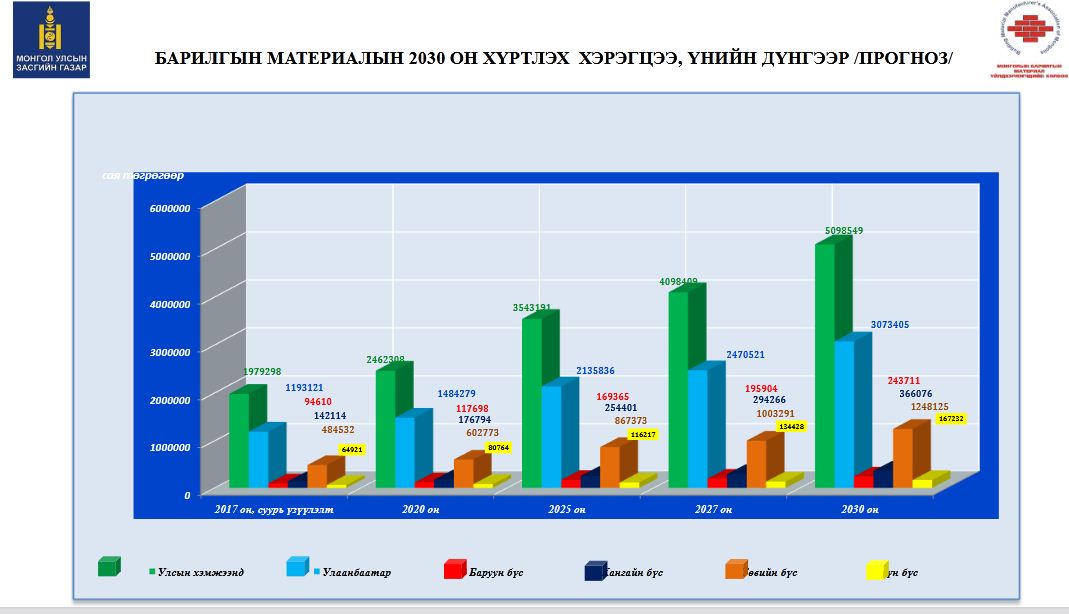 Түүнчлэн ХХААХҮЯ-наас танилцуулсан судалгаагаар барилгын материалын эрэлт, хэрэгцээ 2030 он хүртэлх хугацаанд тогтмол өсөх төлөвтэй байгаа. Дараах төсөөлөл тооцооллоос үзэхэд нийт импортод эзлэх барилгын материалын хэмжээ болон үнийн дүн цаашид ч нэмэгдэхээр байгааг уншигч та харж байна.