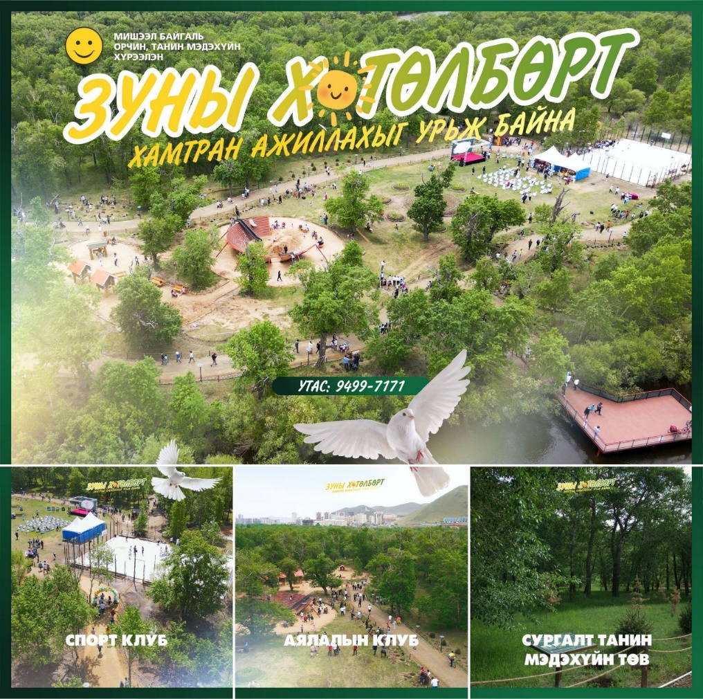 Мишээл байгаль орчин, танин мэдэхүйн хүрээлэнд хэрэгжүүлэх олон нийтийг хамарсан спортын хөтөлбөр, дугуйлан, тэмцээн уралдаан, иога, олон төрөлт үйл ажиллагааг зохион байгуулах боломжтой бөгөөд уг ажилд туршлагатай ТББ, КЛУБ, ХУВЬ ХҮН, ЭРҮҮЛ МЭНДИЙН ЧИГЛЭЛ-ийн байгууллагыг дэмжиж, хамтран ажиллахыг урьж байна.