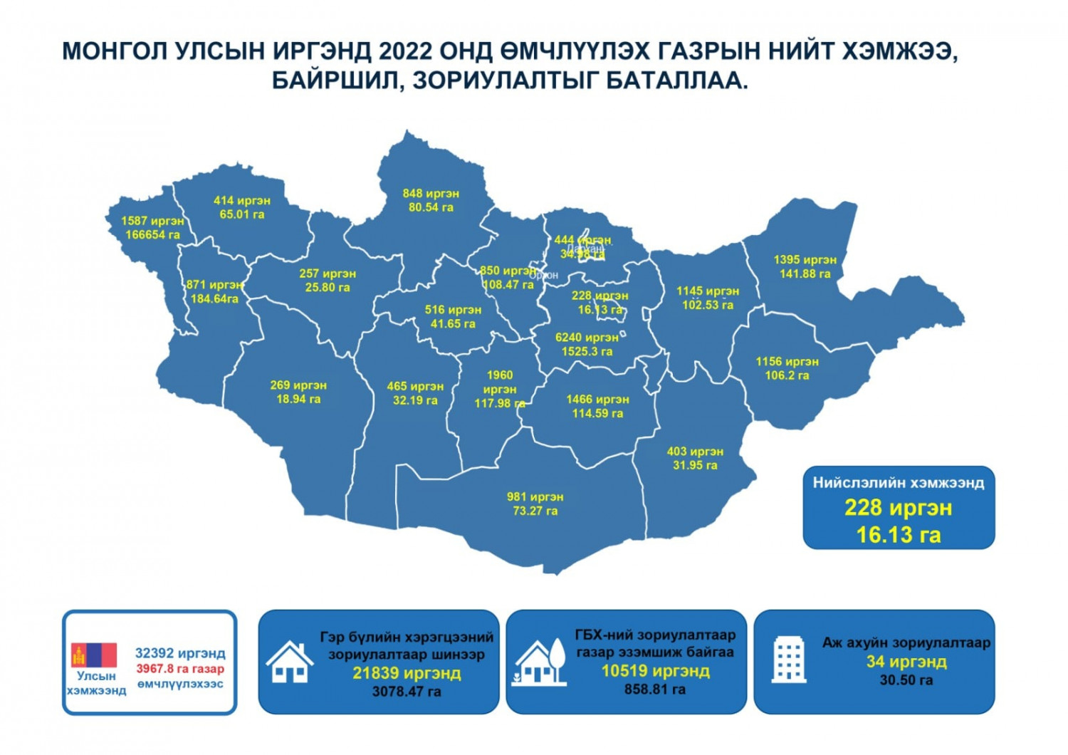 Засгийн газрын энэ сарын 16-ны өдрийн хуралдаанаар “Монгол улсын Иргэнд 2022 онд өмчлүүлэх газрын нийт хэмжээ, байршил, зориулалт”-ыг баталлаа. Улсын хэмжээнд 2022 онд нийт 32 мянган иргэнд 3967.8 га газрыг өмчлүүлэхээр болов.