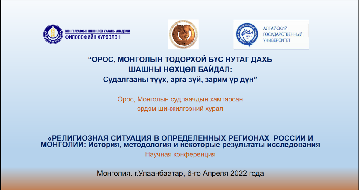 ШУА-ийн Философийн хүрээлэнгээс “Орос, Монголын тодорхой бүс нутаг дахь шашны нөхцөл байдал: Судалгааны түүх, арга зүй, зарим үр дүн” сэдэвт Орос, Монголын судлаачдын хамтарсан эрдэм шинжилгээний цахим хурлыг зохион байгууллаа. Тус хурал нь Шашин судлалын салбарт хэрэгжиж буй “XIX–XXI зууны эхэн үеийн Сибирийн болон Монголын тодорхой бүс нутаг дахь шашны нөхцөл байдалд угсаатан-соёлын ба улс төрийн үйл явцын нөлөө” (2021-2023) нэртэй хамтарсан төслийн хүрээнд зохион байгуулагдсан. Төслийн удирдагчаар ОХУ-ын Барнаулын Алтай их сургуулиас тэнхимийн эрхлэгч, доктор, дэд профессор Е.А.Шершнева, Философийн хүрээлэнгийн Шашин судлалын салбарын ЭША, доктор /Sc.D/, профессор М.Гантуяа нар ажиллаж байна.