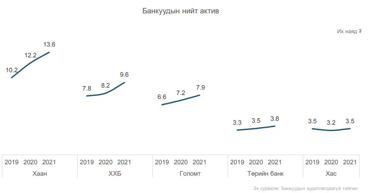 Тэгвэл системийн нөлөө бүхий 5 банкны хоёрдугаарт жагсаж, зах зээлийн 23.4 хувийг эзэлж буй Худалдаа хөгжлийн банкны нийт актив 2021 онд 8.2 их наядаас 9.6 их наяд орчим болж өссөн байгаа. Өнгөрсөн онд Худалдаа хөгжлийн банк, Улаанбаатар хотын банкууд нэгдсэнтэй холбоотойгоор активын өсөлт нь 1.4 их наядаар хэмжигдэж байгаа.