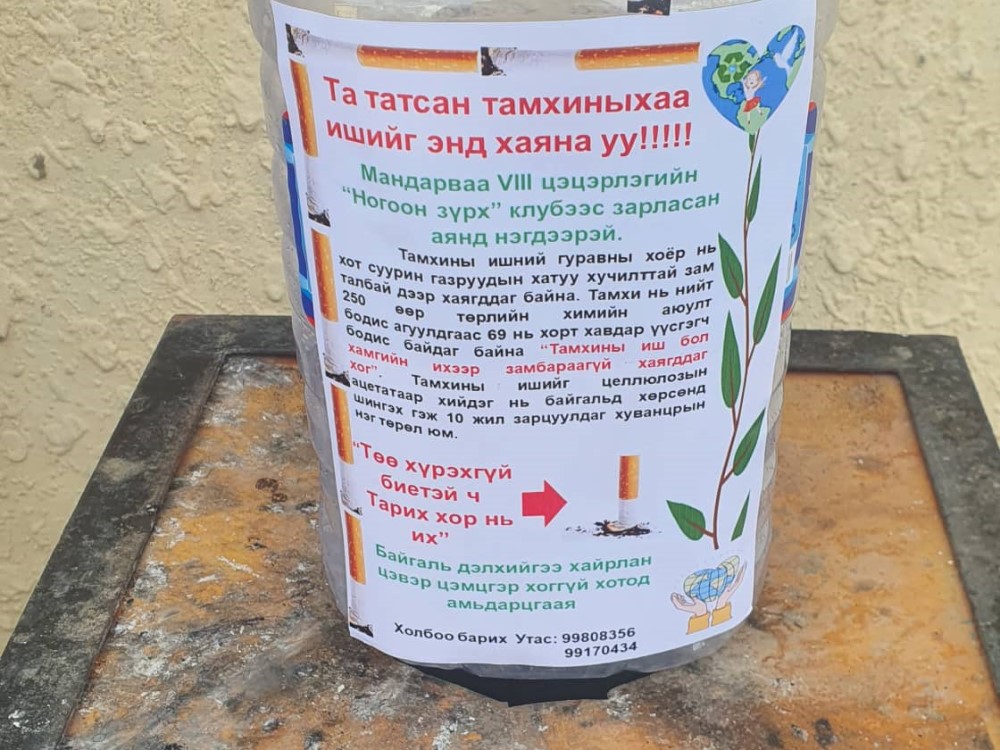 Тодруулбал, тус цэцэрлэгийн хамт олон "Eco school Mongolia" гэх Олон Улсын хөтөлбөрт хамрагджээ. Тус хөтөлбөрийн хүрээнд хог хаягдлын талаар дэлгэрэнгүй, нарийвчлан судалсан байна. Ийн судлахад тамхины иш хорт хавдар үүсгэгч бодисыг агуулдаг ба хөрсөнд шингэхдээ 10 жилийг зарцуулдаг талаар олж мэджээ. Улмаар нэг кг-ийг нь 5000 мянган төгрөгөөр худалдан авах аян зохион байгуулах болсон байна. Аяныг өчигдрөөс (2022.04.27) эхэлжээ. Тамхины ишийг цэцэрлэгийн байрандаа хүлээн авахын зэрэгцээ таксины зогсоол, эмнэлгийн гадна талбай гэх мэт хүн олноор цугладаг газруудад сав байрлуулж байгаа аж.