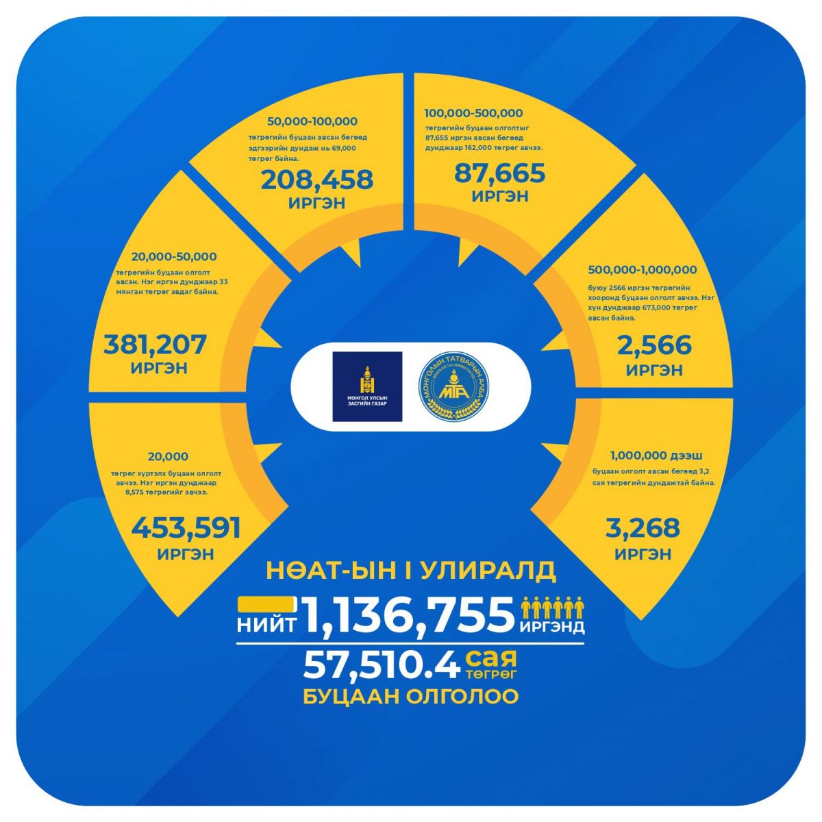 Буцаан олголтоо авсан иргэдийн 39.9% нь 20,000 хүртэлх төгрөгийн, 0.3% буюу 3,268 иргэн нэг сая төгрөгөөс дээш урамшуулал авсан байна.
