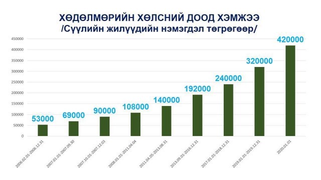 Эргэн сануулахад, хөдөлмөрийн хөлсний доод хэмжээ 2019 онд 320 мянган төгрөг байсныг 2020 онд 420 мянган төгрөг болгож нэмэгдүүлсэн. Тэгвэл сүүлийн жилүүдэд хэрхэн нэмэгдсэн талаарх мэдээллийг доорх графикаас харна уу.
