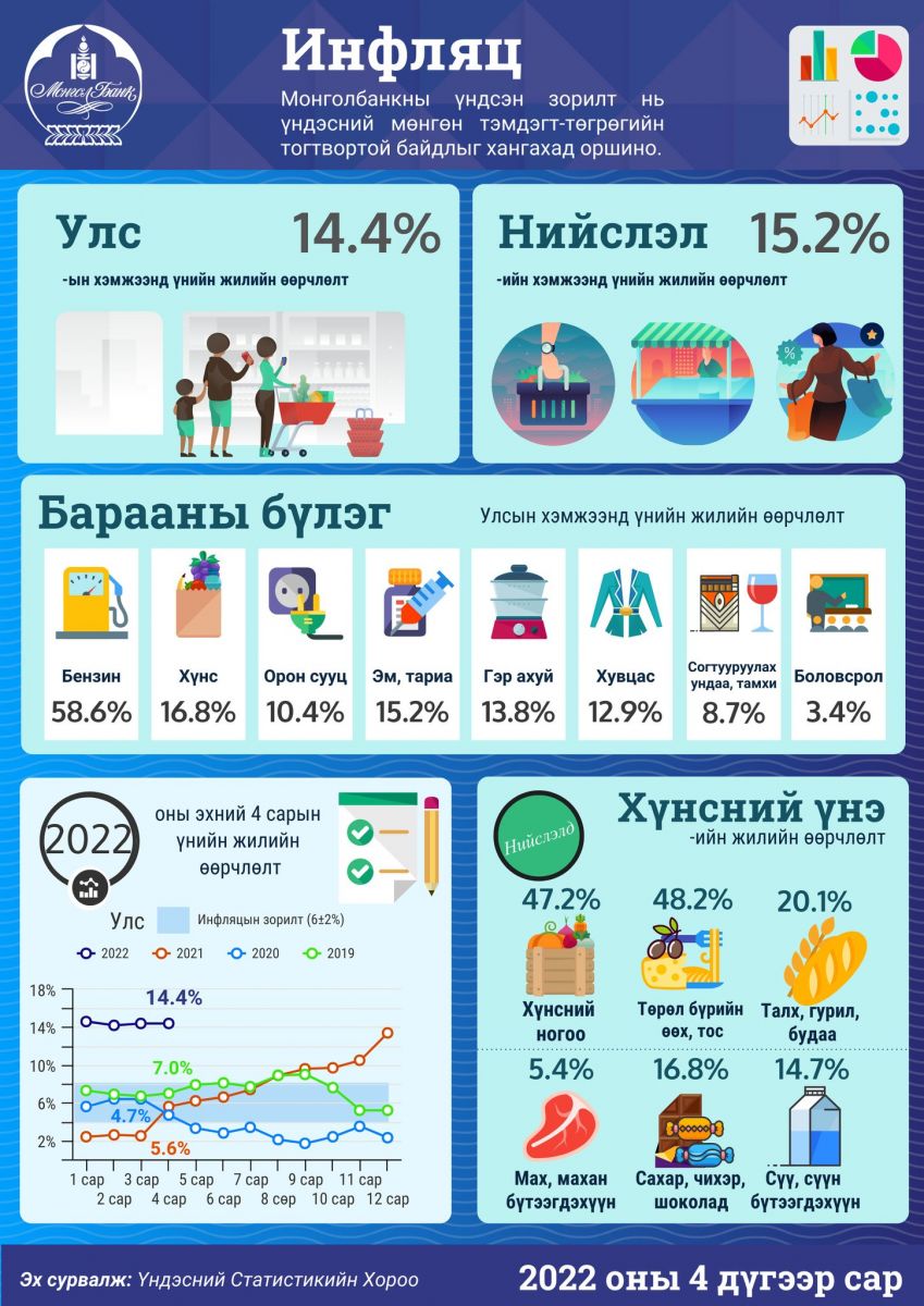 Инфляц буюу хэрэглээний бараа, үйлчилгээний үнэ энэ оны дөрөвдүгээр сард улсын хэмжээнд өмнөх оны мөн үеэс 14.4 хувь, өмнөх оны эцсээс 6.4 хувь, өмнөх сараас 2.3 хувиар өссөнийг Үндэсний статистикийн хорооноос мэдээлсэн. Улаанбаатар хотын инфляц 15.2 хувьтай гараад байна.