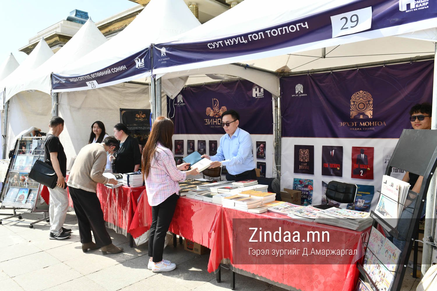 Үндэсний номын сангийнхан ном судраа зэхэн монгол гэрт төвхнөжээ. Энэ удаагийн номын баярт тэд хүүхдэд зориулсан ном судрын хэсгүүдийг онцолсон гэнэ. Үндэсний номын сангийн сан хөмрөг, хадгаламжийн хэлтсийг хариуцдаг Б.Тунгалаг “Манай номын санд байгаа 57 нэрийн судар ном, бичигт туссан хуучны муутуу цаасан дээр хар бэх, бийрээр бичсэн судруудаас хүүхдийн тухай өгүүлсэн 200 гаруй хуудас материалаас шилж сонгож аваад, хуулбараар нь энд үзэсгэлэн дэглэсэн. Монголчууд хүүхдийг багаас нь энэ хүүхэд төрийн хүн болох нь ээ гэх мэтээр шинждэг. Моринд гарамгай, суманд мэргэн хүүхдүүдийг бол яг тэр зүг рүү нь чиглүүлж сургадаг байж. Ном эрдэм түгээн дэлгэрүүлэх, эрүүл саруул байлгахад тусалдаг, хүүхдэд ээлтэй Банзрагч, Жадамба судрыг энд эхээр нь залсан” гэв. Тэдний гэрээр зочилсон иргэд уг ном судраас адис авч байна лээ. Төв талбайд номын энерги бүрэлдэхэд Үндэсний номын сангийн гэрийн хойморт заларсан эдгээр зузаан гээчийн судрууд хувь нэмрээ оруулсан нь лав.