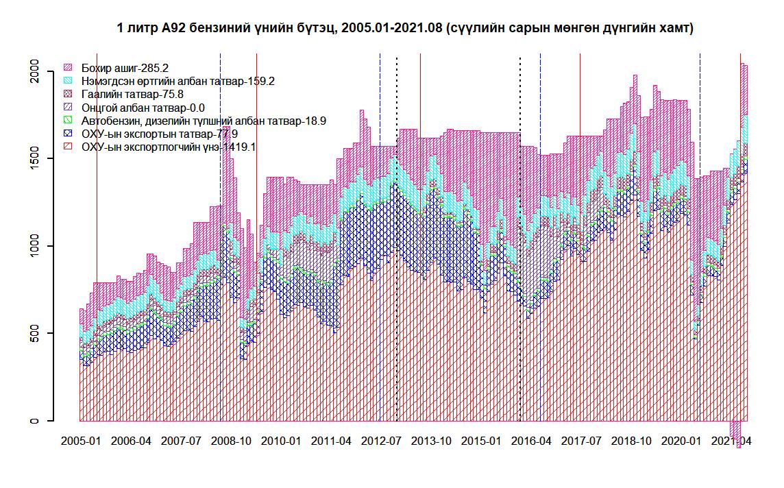 Цэнхэр босоо зураасууд нь УИХ-ын сонгуулиуд, улаанууд нь Ерөнхийлөгчийн сонгуулиудыг тэмдэглэж байгаа. Харин тасалдсан хоёр босоо зураасын дундах үе нь өмнөх үнэ тогтворжуулах хөтөлбөрийн үе юм. Эндээс дэлхийн зах зээлийн үнийн бууралттай холбоотой ОХУ-ын экспортлогч компанийн үнэ ОХУ-ын Засгийн газрын экспортын татвар буурахад манайд үнэ буураагүйг харж болно. Энэ бол үнэ тогтворжуулах хөтөлбөрийн үр дүн.