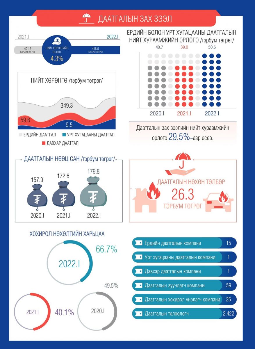 Даатгалын салбарын нийт хөрөнгийн хэмжээ өмнөх оноос 4.3 хувиар өсөж 418.5 тэрбум төгрөгт, нөөц сан 4.2 хувиар өсөж 179.8 тэрбум төгрөгт хүрчээ. Ердийн болон урт хугацааны даатгалын салбар 25.3 их наяд төгрөгийн даатгалын үнэлгээтэй 1,017,205 зүйлийг даатгаснаар нийт хураамж өмнөх оны мөн үетэй харьцуулахад 29.5 хувиар өсөж 50.5 тэрбум төгрөгийг татан төвлөрүүлсэн байна.