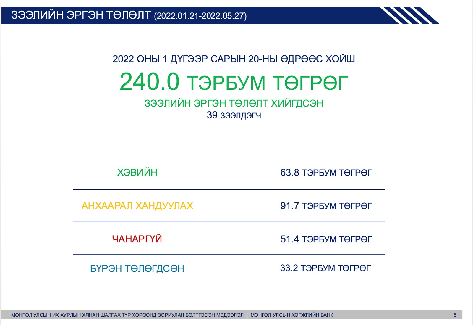 2022 оны 1 дүгээр сарын 20-ны өдрөөс хойш 39 зээлдэгч 240 тэрбум төгрөгийн зээлийн эргэн төлөлт хийжээ.