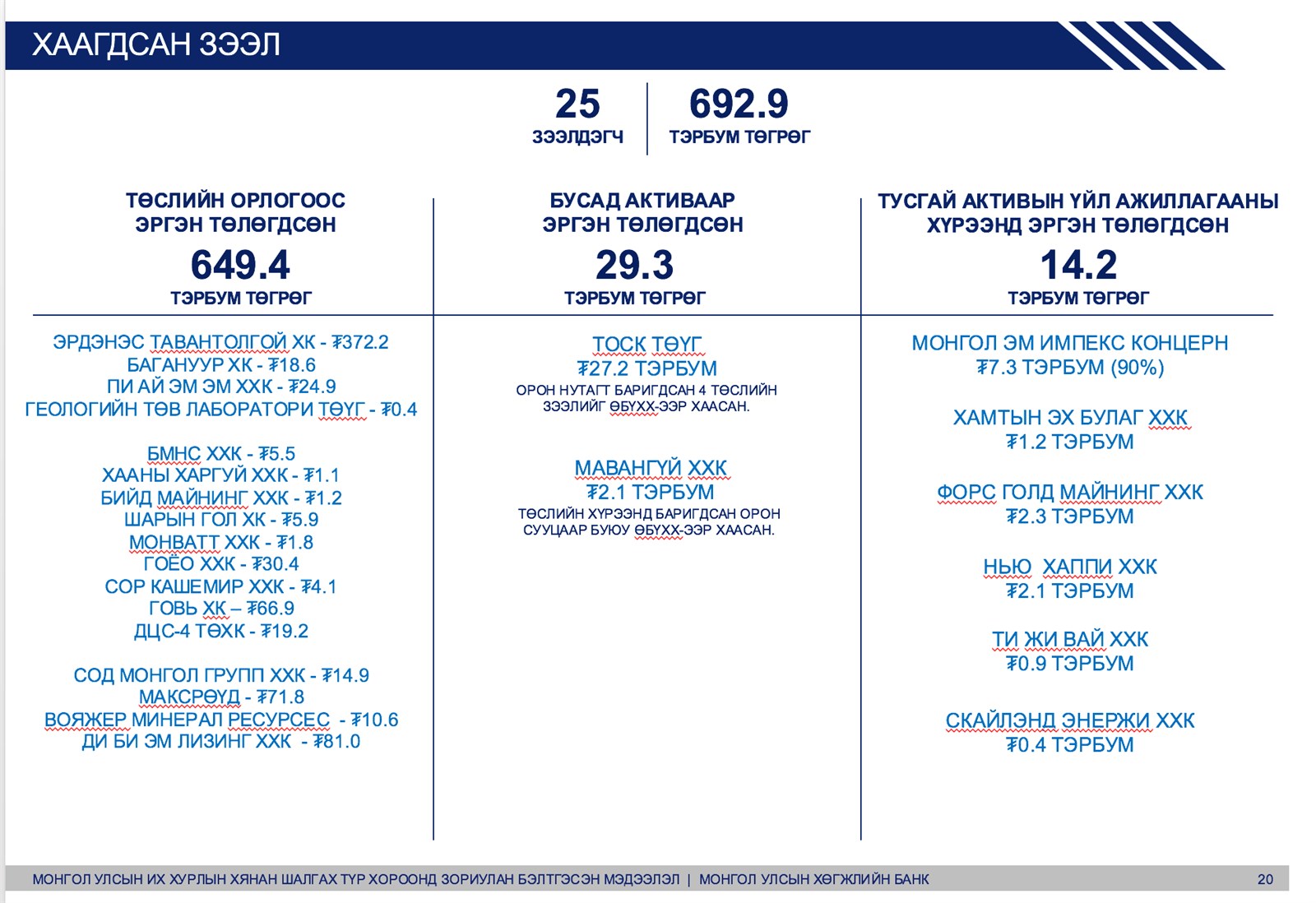 Хаагдсан зээлийн хувьд, 25 зээлдэгчийн 692 тэрбум төгрөгийн зээл хаагдсан. Үүнээс төслийн орлогоос эргэн төлөгдсөн 649 тэрбум, бусад активаар эргэн төлөгдсөн 29 тэрбум, тусгай активын үйл ажиллагааны хүрээнд эргэн төлөгдсөн 14 тэрбум төгрөг байна.