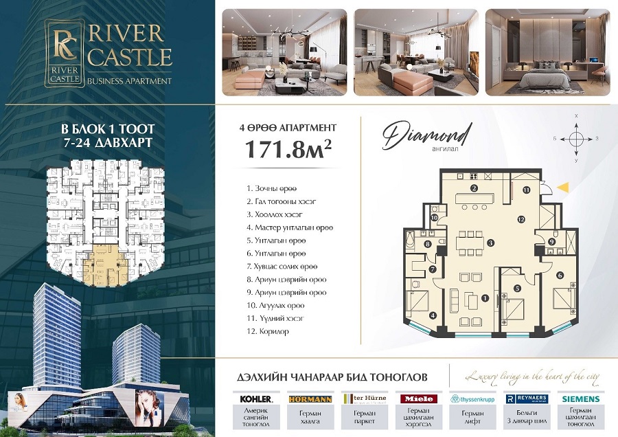 Эрхэм та дэлхийд чанараар тэргүүлэгч шилдэг брэндүүдээр тоноглосон, тайван орчин, тав тухыг мэдрүүлэх Crystal, Diamond, Penthouse ангиллын дээд зэрэглэлийн орон сууцнуудаас сонголтоо хийх боломжтой.