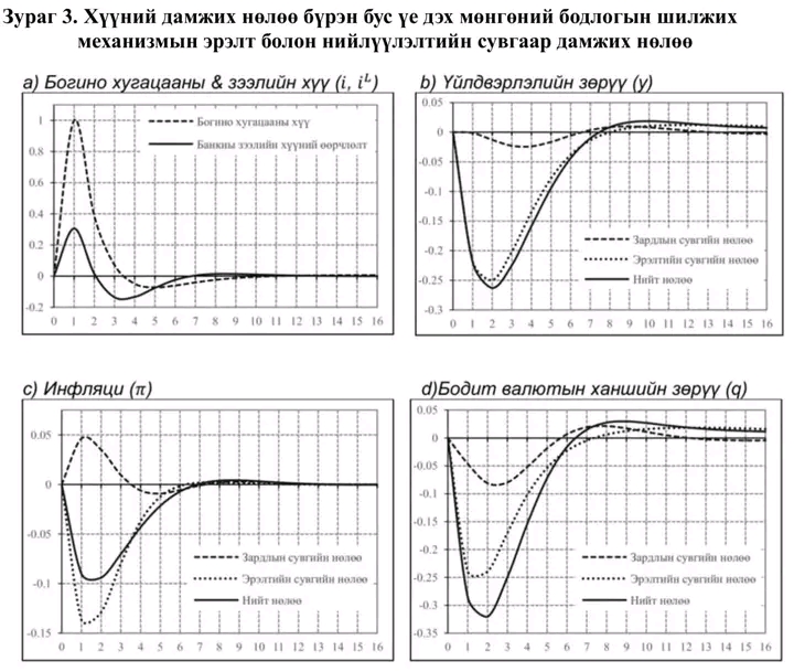 Бодлогын хүүний 1 нэгж хувийн өсөлт нь зээлийн хүүг 0.32 нэгж хувиар өсгөхөөр байна. Зээлийн хүү энэ хэмжээгээр өссөнөөр НИЙЛҮҮЛЭЛТИЙН СУВГААР ДАМЖИН үйлдвэрлэгчийн зардал өссөнөөр үйлдвэрлэл бага зэрэг буурахын зэрэгцээ улирлын инфляцыг 0.05 нэгж хувиар өсөхөөр байна. Харин бодлогын хүүний өсөлт нь ЭРЭЛТИЙН СУВГААР ДАМЖИН үйлдвэрлэлийг илүү хүчтэй бууруулж, улмаар инфляцыг 0.14 нэгж хувиар бууруулж байна. Эдгээр 2 суваг нь үйлдвэрлэлийг бууруулахад адил чиглэлд нөлөөлснөөр үйлдвэрлэл суурь утгаас 0.25 хувиар буурах бол инфляцын хувьд харилцан эсрэг чиглэлд нөлөөлж, ЭРЭЛТИЙН СУВГИЙН НӨЛӨӨ (хүүний болон валютын ханшаар дамжих суваг) давамгайлснаар инфляц 0.09 нэгж хувиар буурахаар байна. Харин бодит валютын ханшийн хувьд эдгээр сувгууд нь ижил чангаруулах чиглэлд нөлөөлж байна. Өөрөөр хэлбэл, эрэлтийн сувгийн хувьд хүүний өсөлт нь нэрлэсэн ханшаар голлон дамжиж бодит ханшид шилжих бол нийлүүлэлтийн сувгийн хувьд инфляцыг өсгөх замаар бодит ханшид нөлөөлж байна. Энэхүү судалгааны үр дүнгээр Монголын эдийн засагт БОДЛОГЫН ХҮҮНИЙ ӨСӨЛТ ИНФЛЯЦЫГ НЭМЭГДҮҮЛДЭГ гэсэн таамаглал няцаагдсан юм. Энэ нь бодлогын хүүний өсөлт нь инфляц, инфляцын хүлээлтийг бууруулахад туслах эмпирик нотолгоо буюу Тейлор зарчмын дагуу инфляцад бодлогын хүүгээр хариу үйлдэл үзүүлэх нь үр дүнтэй байх үндэслэл юм. Гэхдээ ЗАРДЛЫН СУВГИЙН нөлөө тодорхой хэмжээнд үнэлэгдэж байгаа нь бодлогын хүүний нөлөөг сулруулах, зарим өндөр өртэй аж ахуйн нэгж, иргэдэд хүүний өсөлтийн ачаалал давхар орж ирэхийг илтгэж байна. Иймд энэ сувгийн нөлөө хэрхэн өөрчлөгдөж байгааг шинэчлэгдсэн тоон мэдээллийн хувьд ялгаатай шинэлэг аргууд ашиглан дахин судлах нь сонирхолтойн дээр ач холбогдолтой" гэв.