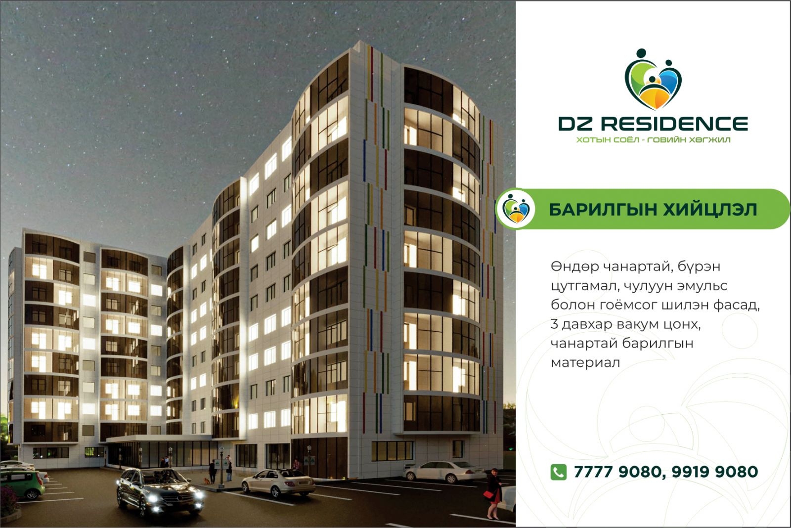 1-4 өрөө бүхий талбайн өргөн сонголттой, хамгийн сүүлийн үеийн интерьер, экстерьер дизайнтай, өргөн цэлгэр цонхтой, чулуун эмульс болон гоёмсог шилэн фасадтай, орчин үеийн чанартай тоноглолтой гээд “DZ Residence" төслийн давуу тал олон.