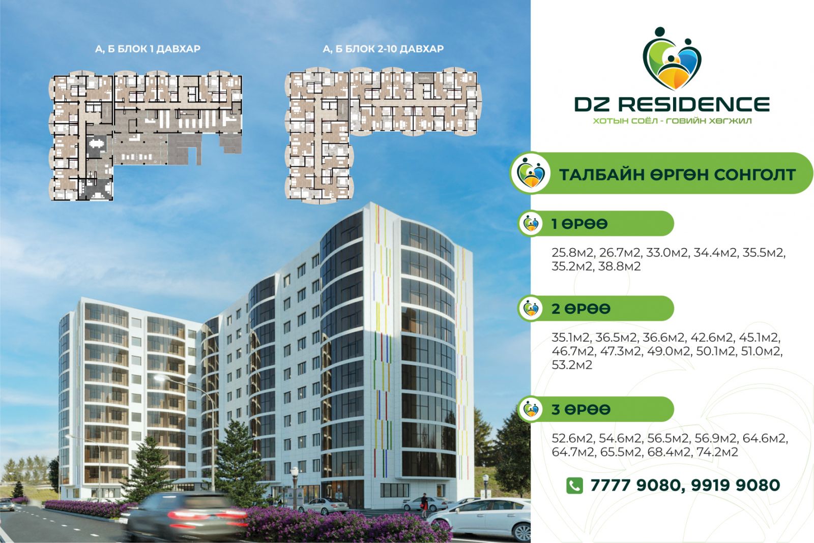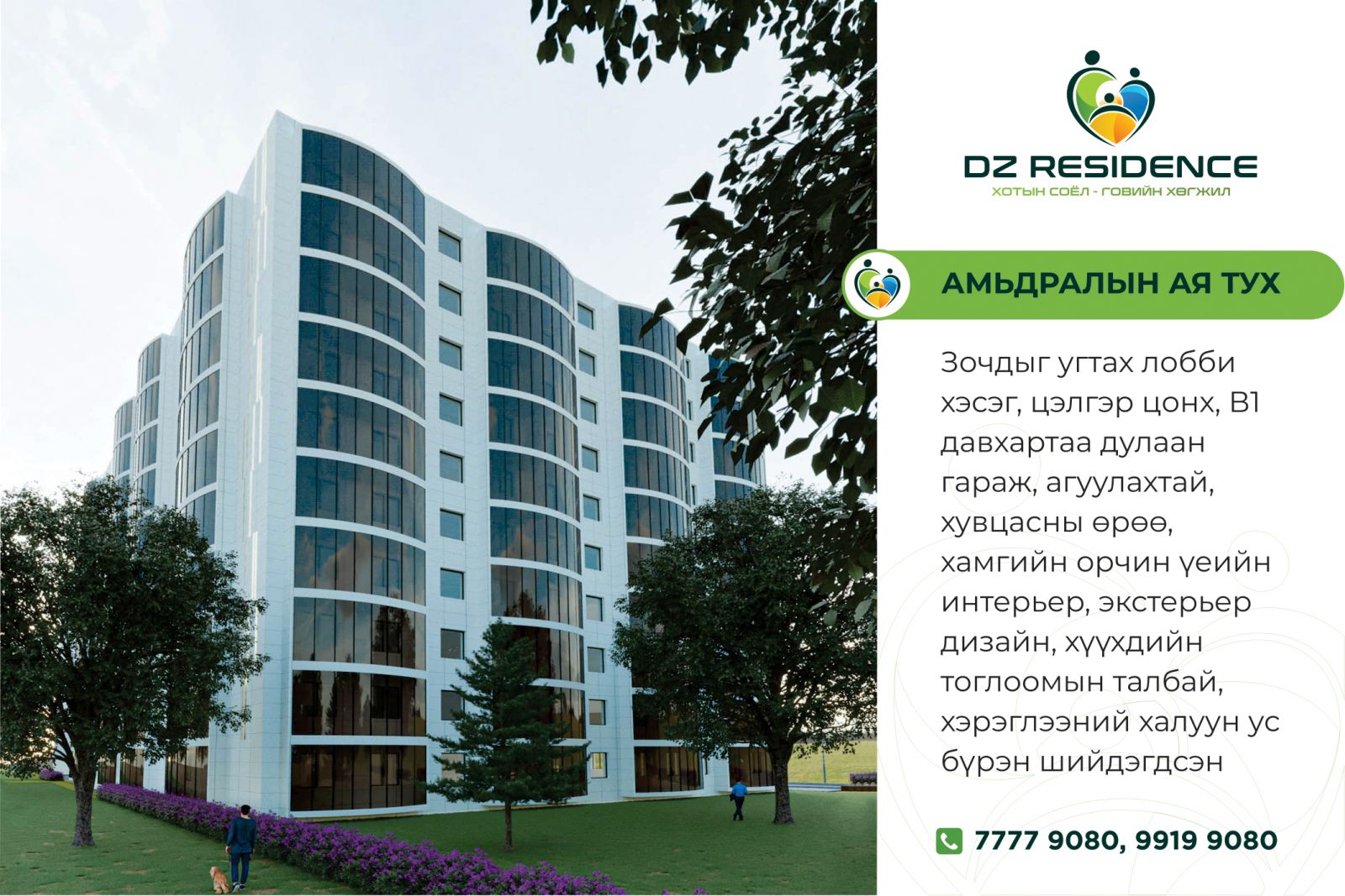 1-4 өрөө бүхий талбайн өргөн сонголттой, хамгийн сүүлийн үеийн интерьер, экстерьер дизайнтай, өргөн цэлгэр цонхтой, чулуун эмульс болон гоёмсог шилэн фасадтай, орчин үеийн чанартай тоноглолтой гээд “DZ Residence" төслийн давуу тал олон.