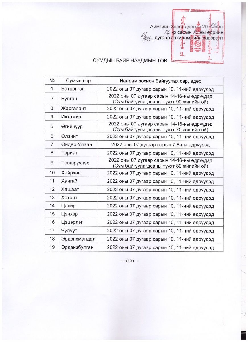 Үндэсний их баяр наадмын тухай хууль 2022 оны зургадугаар сарын 28-ны өдөр УИХ-аар хэлэлцэгдэж шинэчлэн батлагдсантай холбогдуулан Архангай аймгийн Засаг дарга захирамж гарган сумдын баяр наадмын товыг шинэчлэн тогтоолоо.