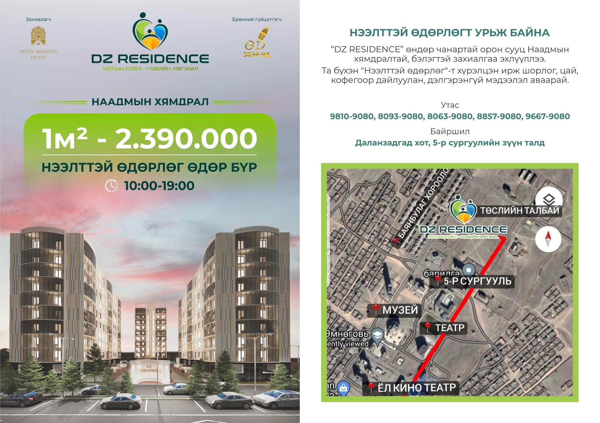 "Эрхэт Монгол" групп, “Эвэр Өд” компанитай хамтран Өмнөговь аймгийн Даланзадгад хотын шинэ суурьшлын бүсэд хэрэгжүүлж буй 650 айлын "DZ Residence" төслийн Нээлттэй өдөрлөг өдөр бүр 19:00 цаг хүртэл үргэлжилж байгаа тул эрхэм та бүхнийг хүрэлцэн ирж, баяр наадмыг угтсан хямдралтай, бэлэгтэй захиалгаа баталгаажуулахыг урьж байна.