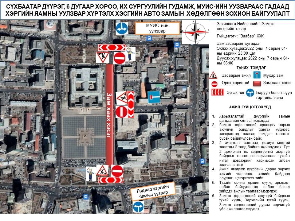 Дээрх хэсгүүдээс эхний хоёрт шинэчлэлийн ажил дууссан бол сүүлийн хэсэг болох МУИС-ийн уулзвараас Гадаад харилцааны яамны уулзвар хүртэлх авто замын засварын ажил эхлээд байна. Тодруулбал, өнөөдөр орой буюу долдугаар сарын 1-ний 23:00 цагаас долдугаар сарын 4-ний 06:00 цаг хүртэл тус замын зорчих хөдөлгөөнийг хязгаарлан, хучилтын ажил гүйцэтгэнэ. Иймд дээрх хугацаанд иргэд, жолооч та бүхэн бусад замыг сонгон хөдөлгөөнд оролцоорой.