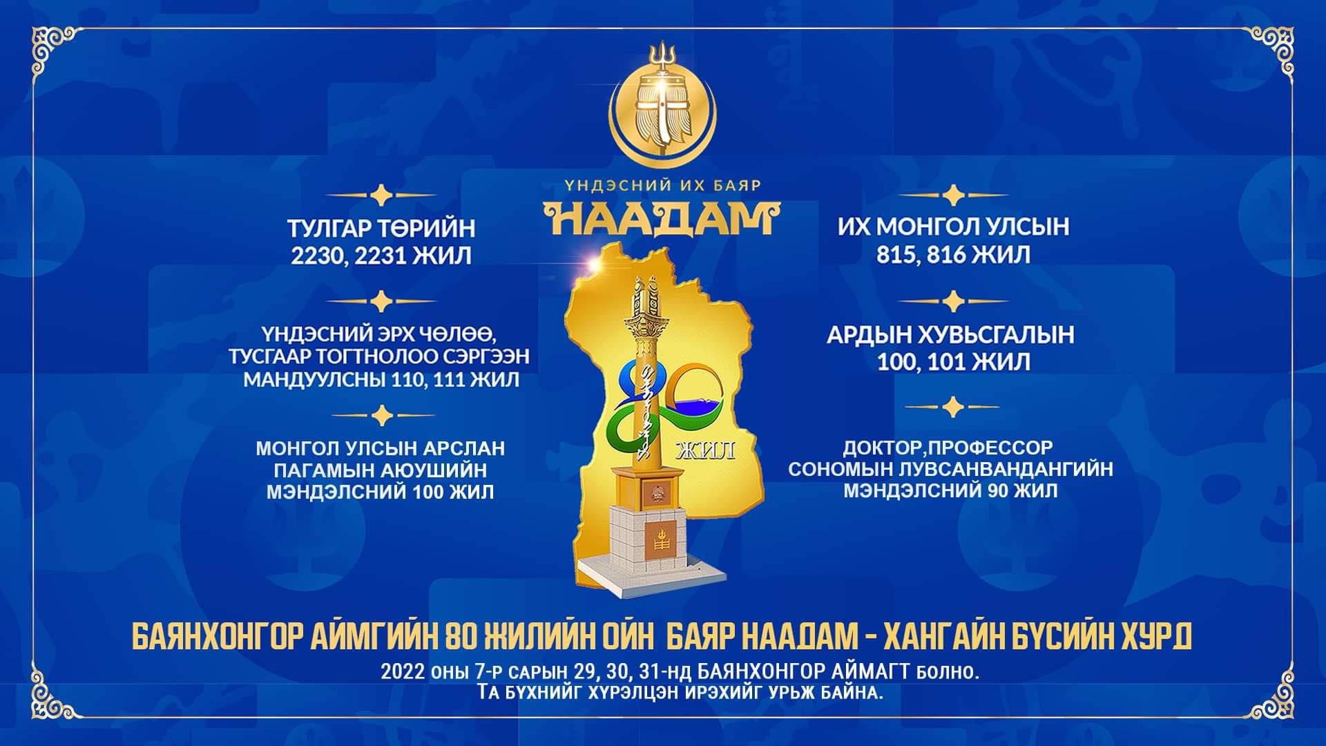 Түүхт, тэгш ойн тохиож буй Баянхонгор аймгийн баяр наадамтай хамтатган Монгол Улсын арслан Пагамын Аюушийн мэндэлсний 100 жил, Доктор, профессор Сономын Лувсанвандангийн мэндэлсний 90 жилийн ойг тэмдэглэх юм.